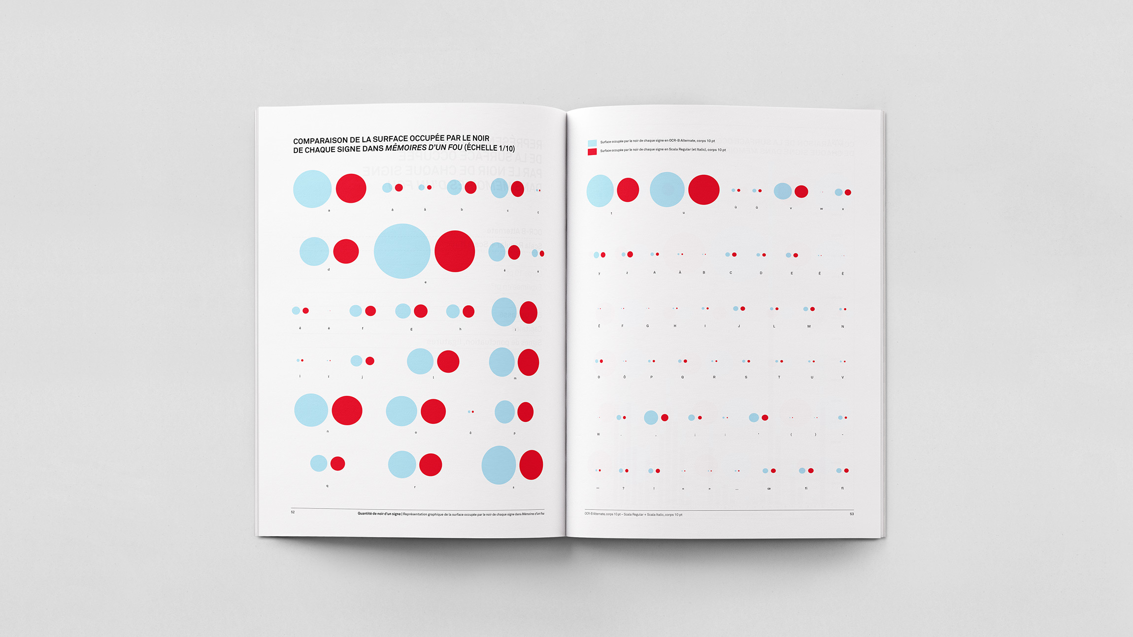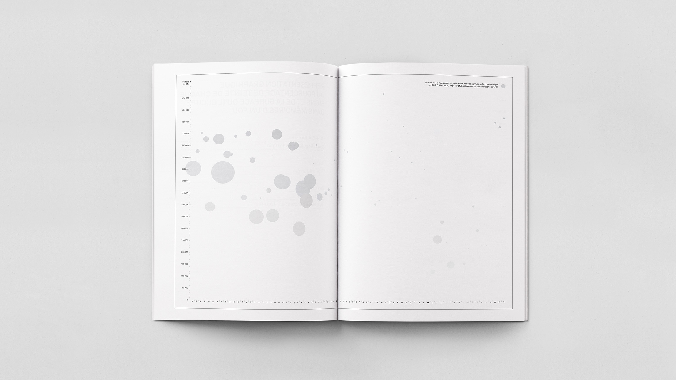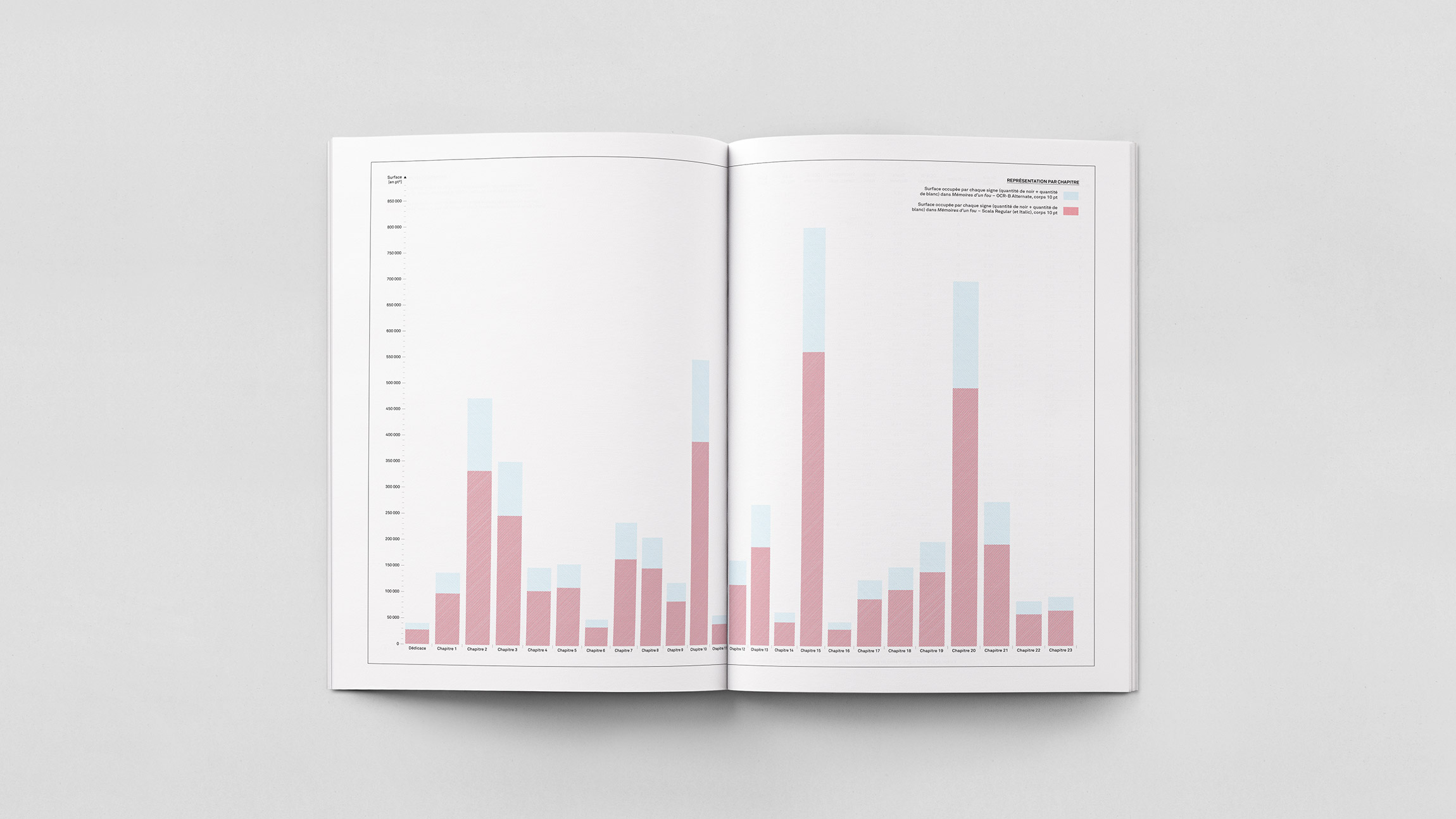 Analyse quantitative de la récurrence des signes typographiques et de la surface qu’ils occupent dans Mémoires d’un fou de Gustave Flaubert, composé tout d’abord en Scala Regular (et Italic) corps 10 pt puis en OCR-B Alternate corps 10 pt.