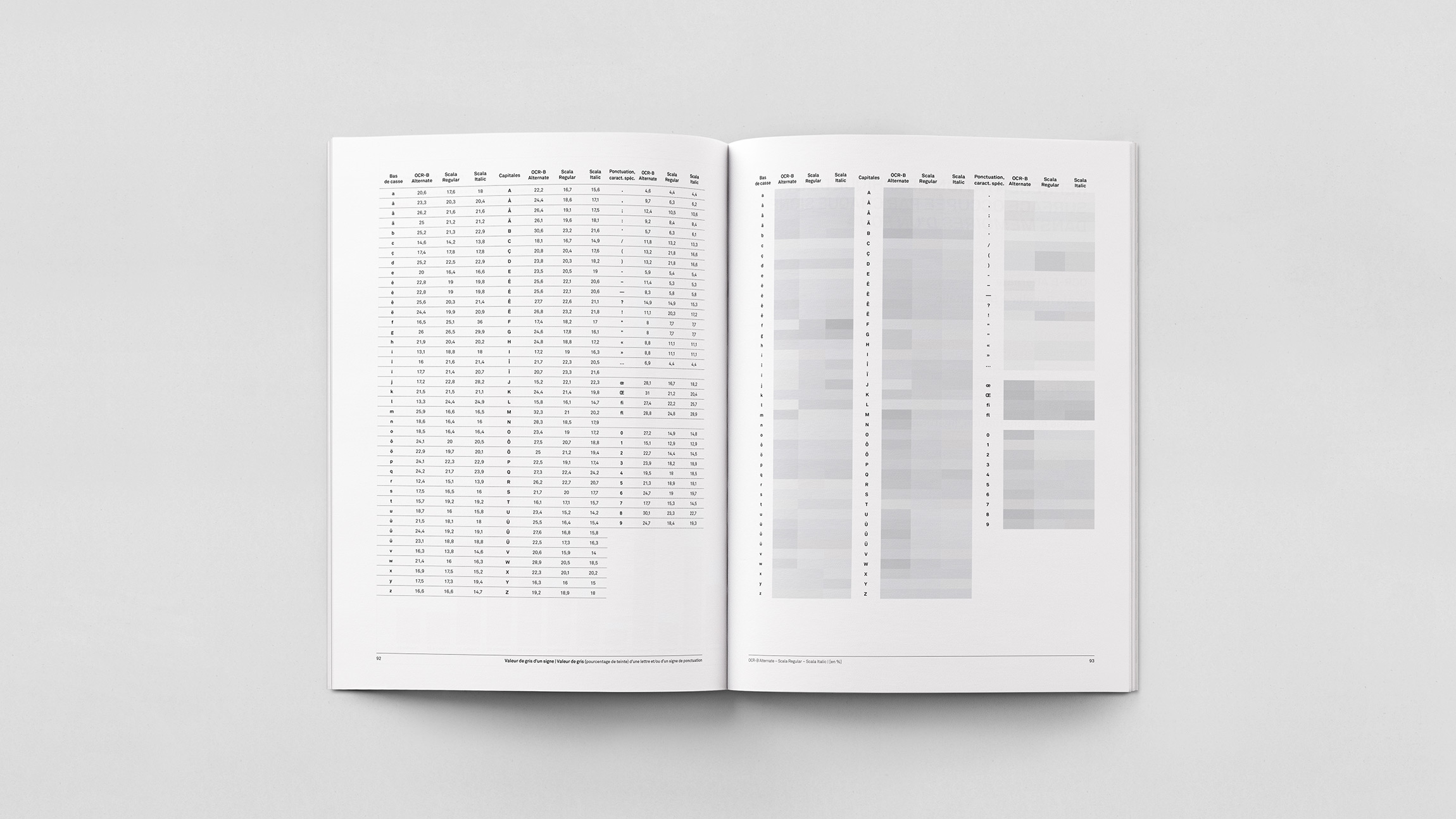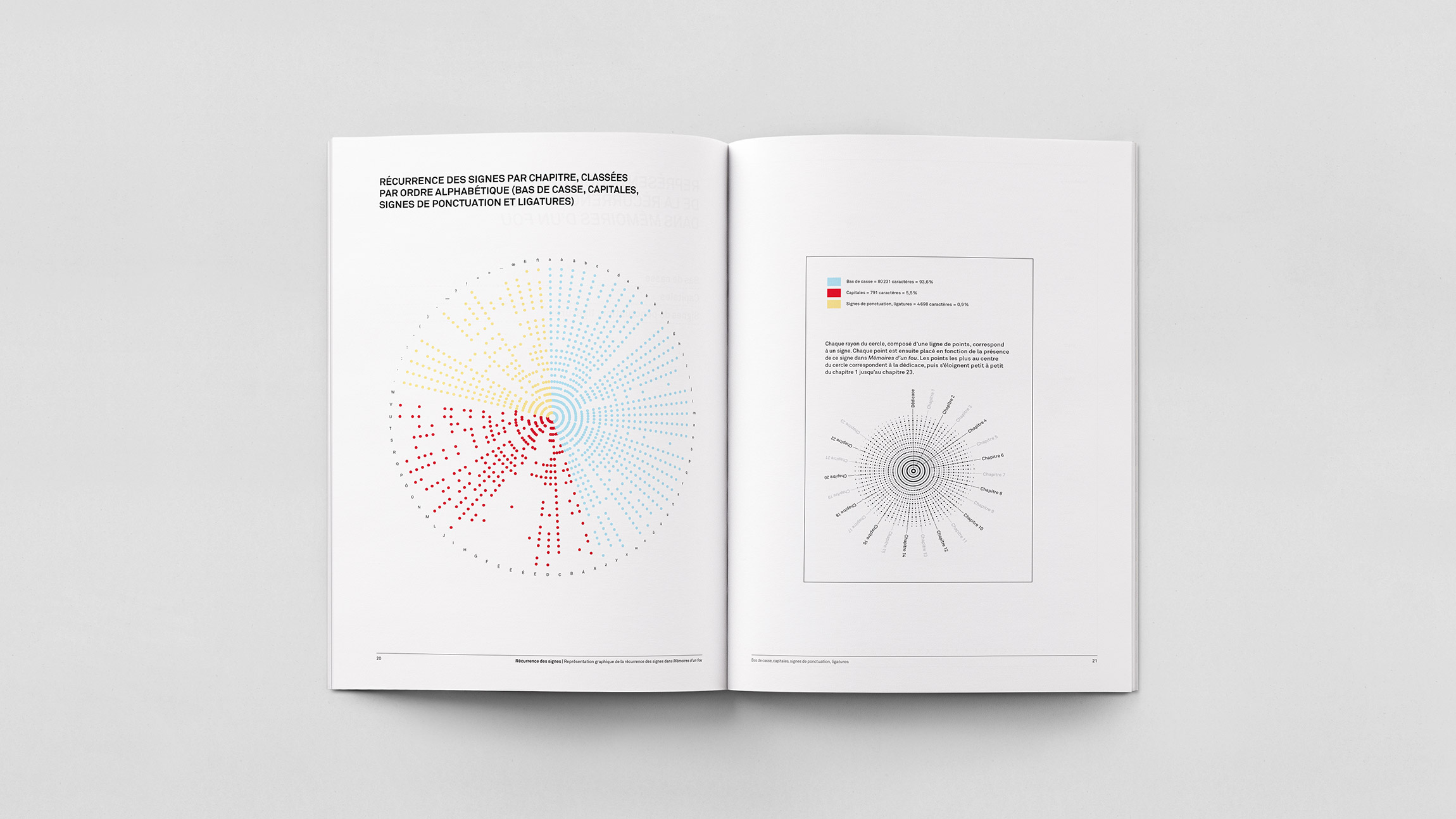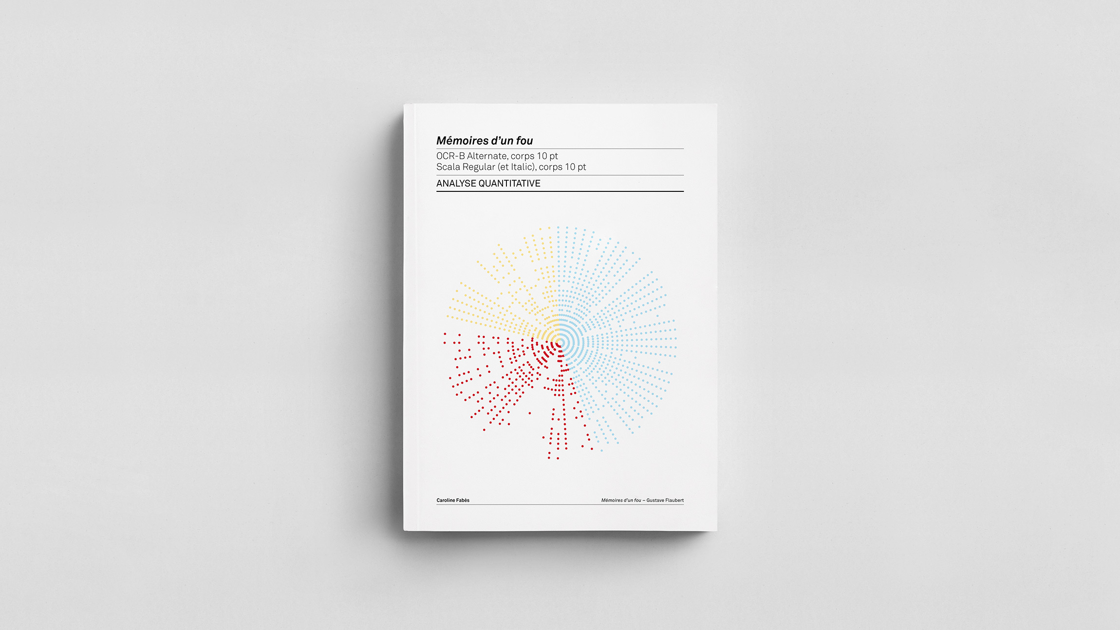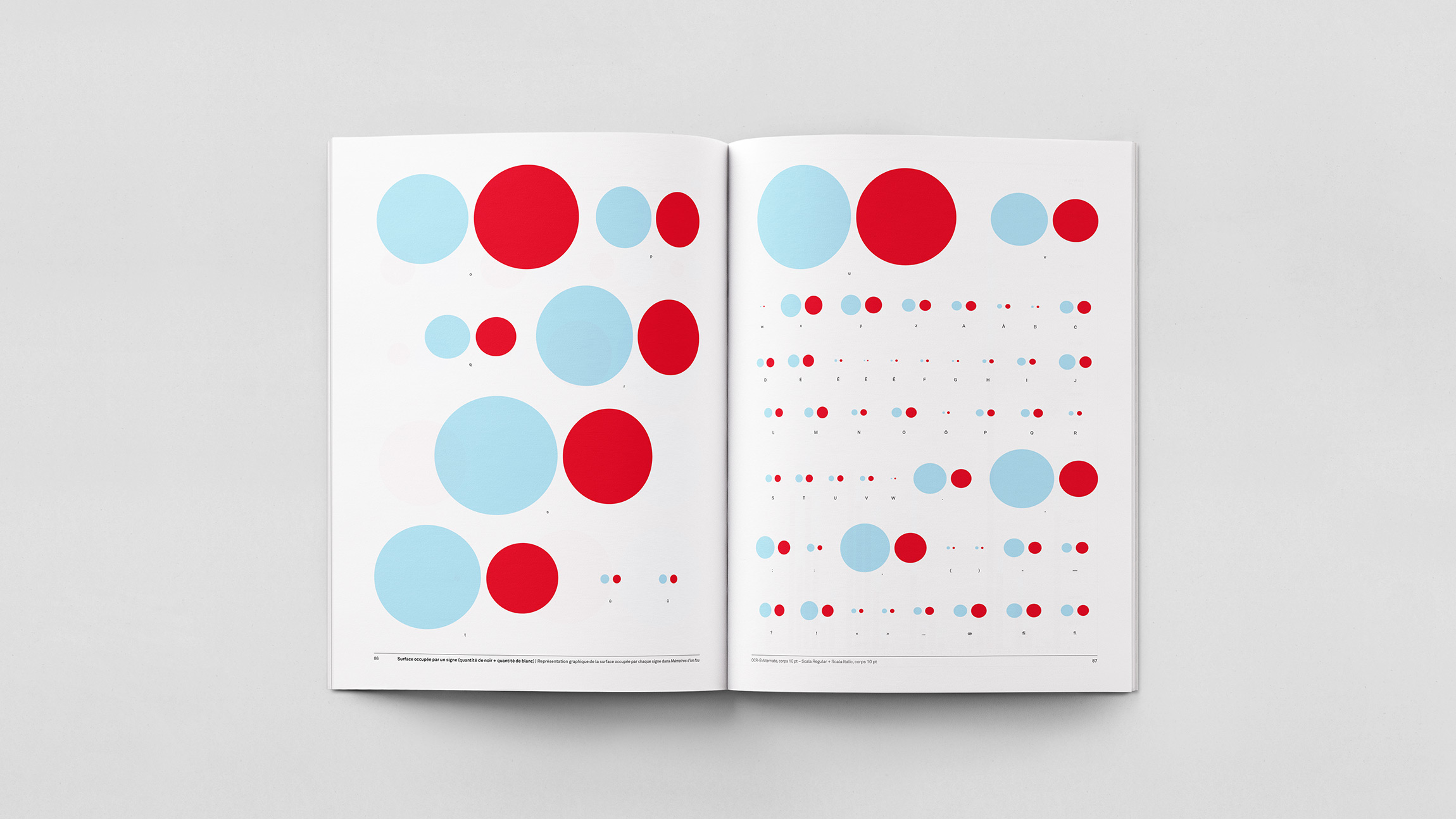 Analyse quantitative de la récurrence des signes typographiques et de la surface qu’ils occupent dans Mémoires d’un fou de Gustave Flaubert, composé tout d’abord en Scala Regular (et Italic) corps 10 pt puis en OCR-B Alternate corps 10 pt.