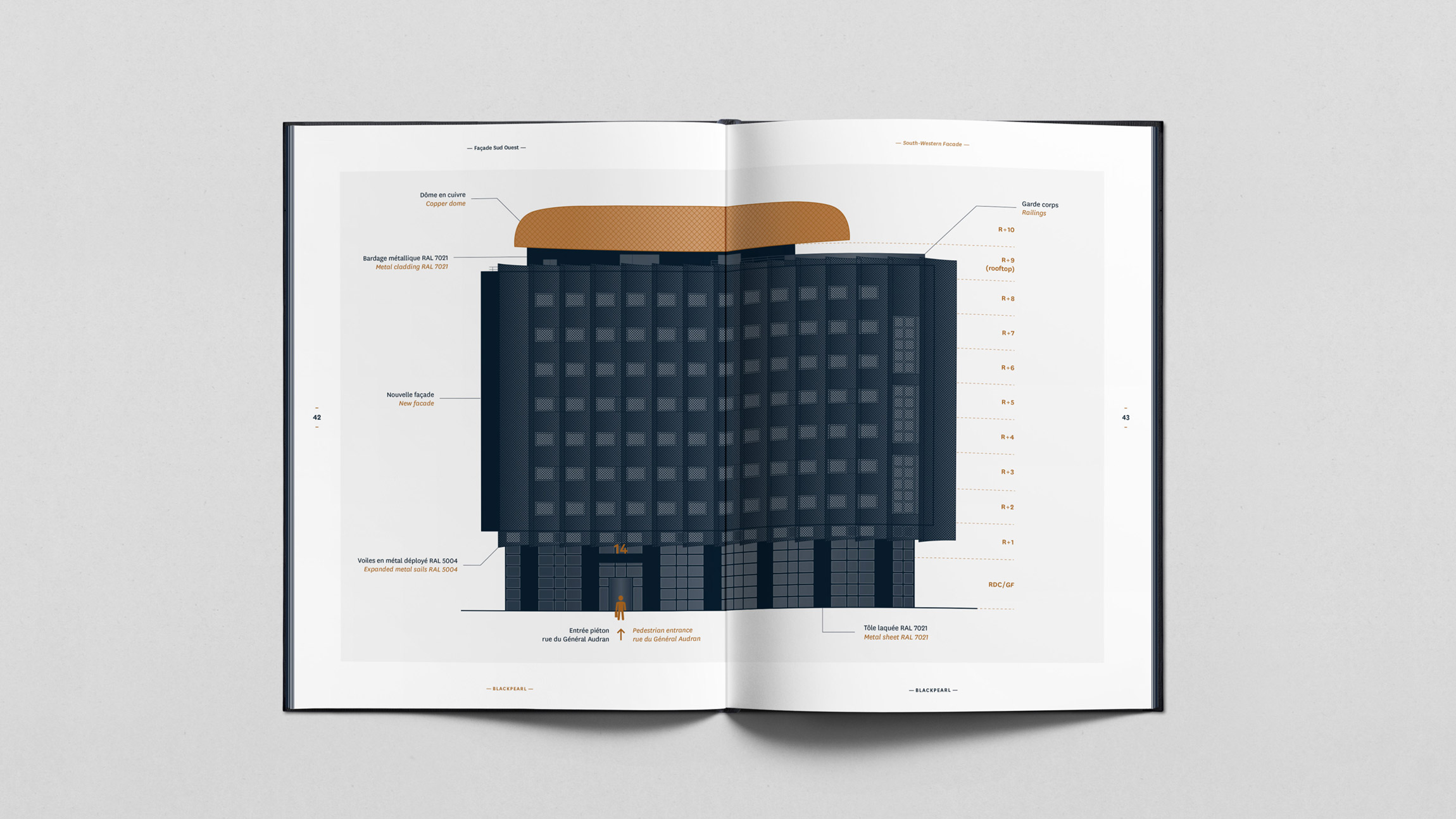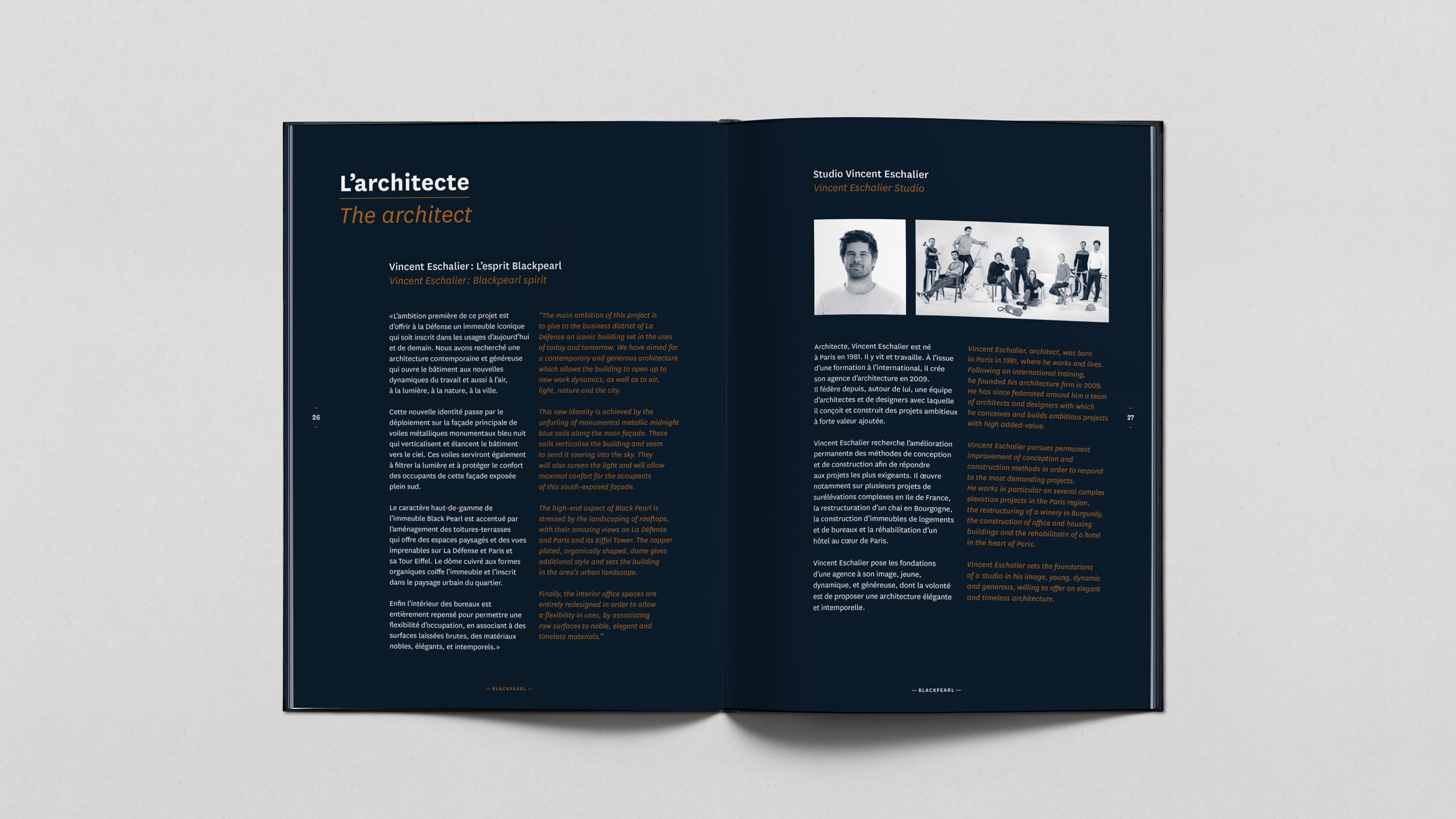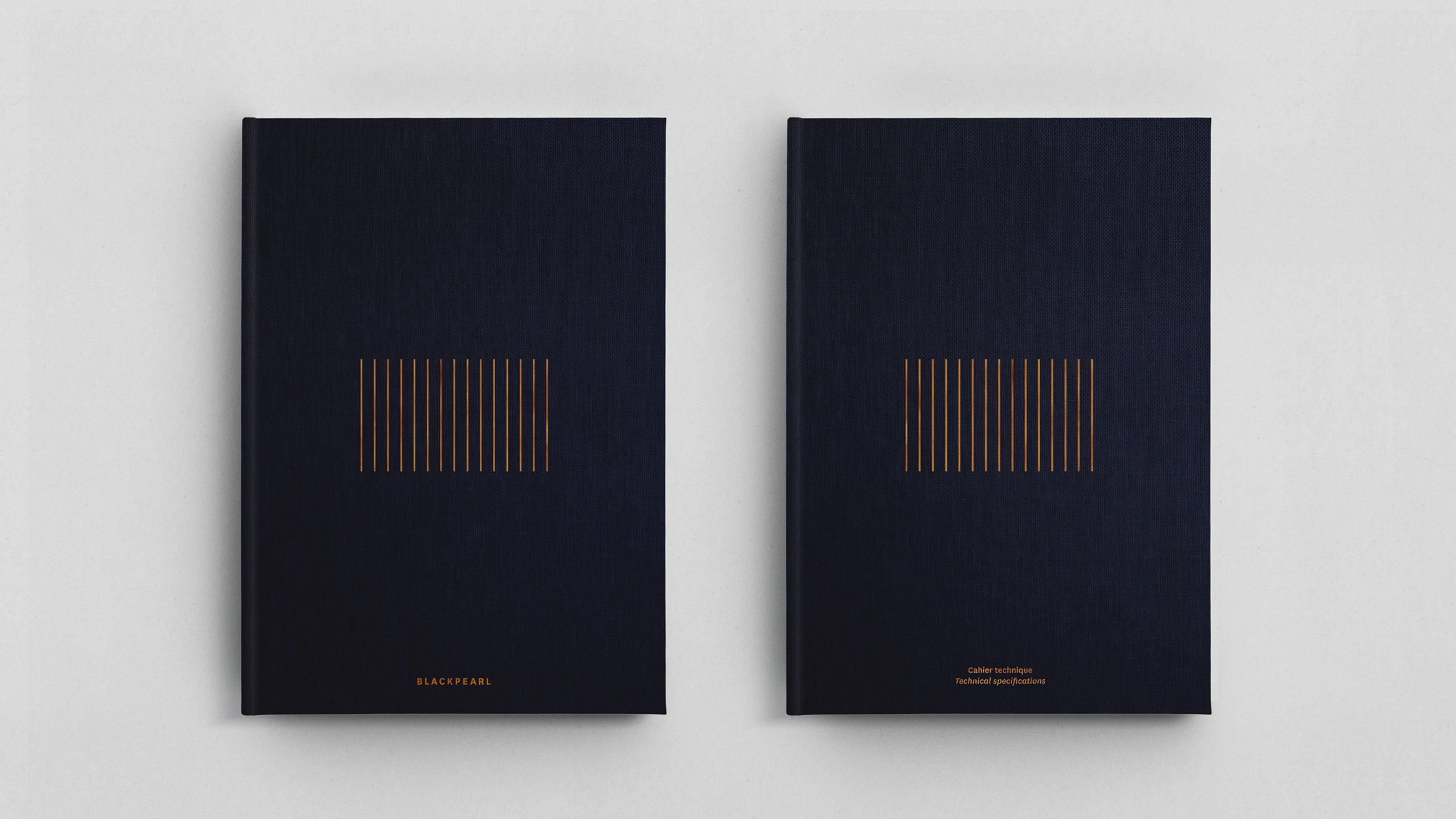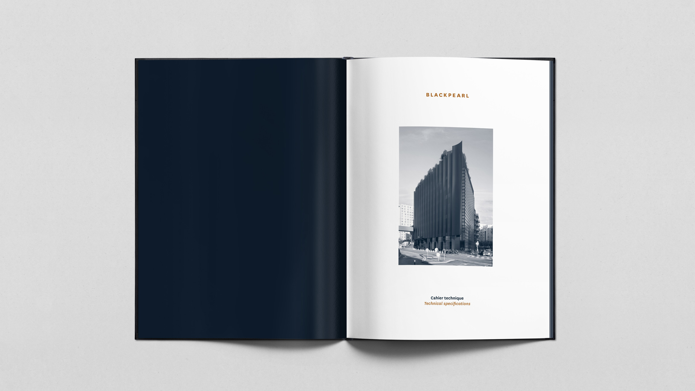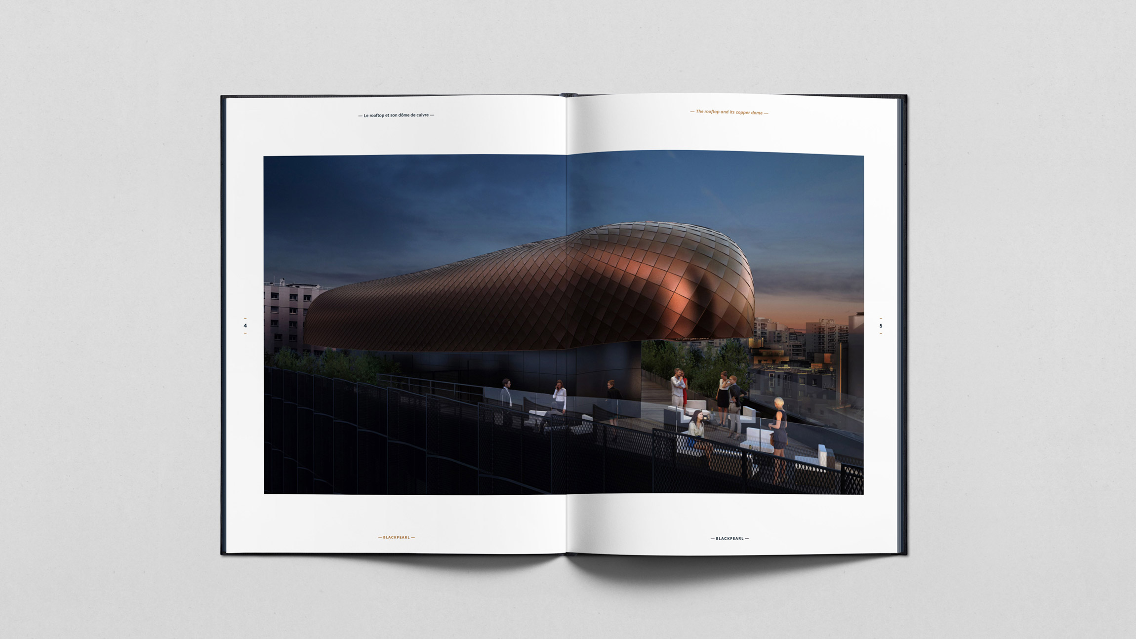 Conception graphique de deux ouvrages sur la nouvelle identité architecturale de l’immeuble Blackpearl situé à la Défense (Paris).