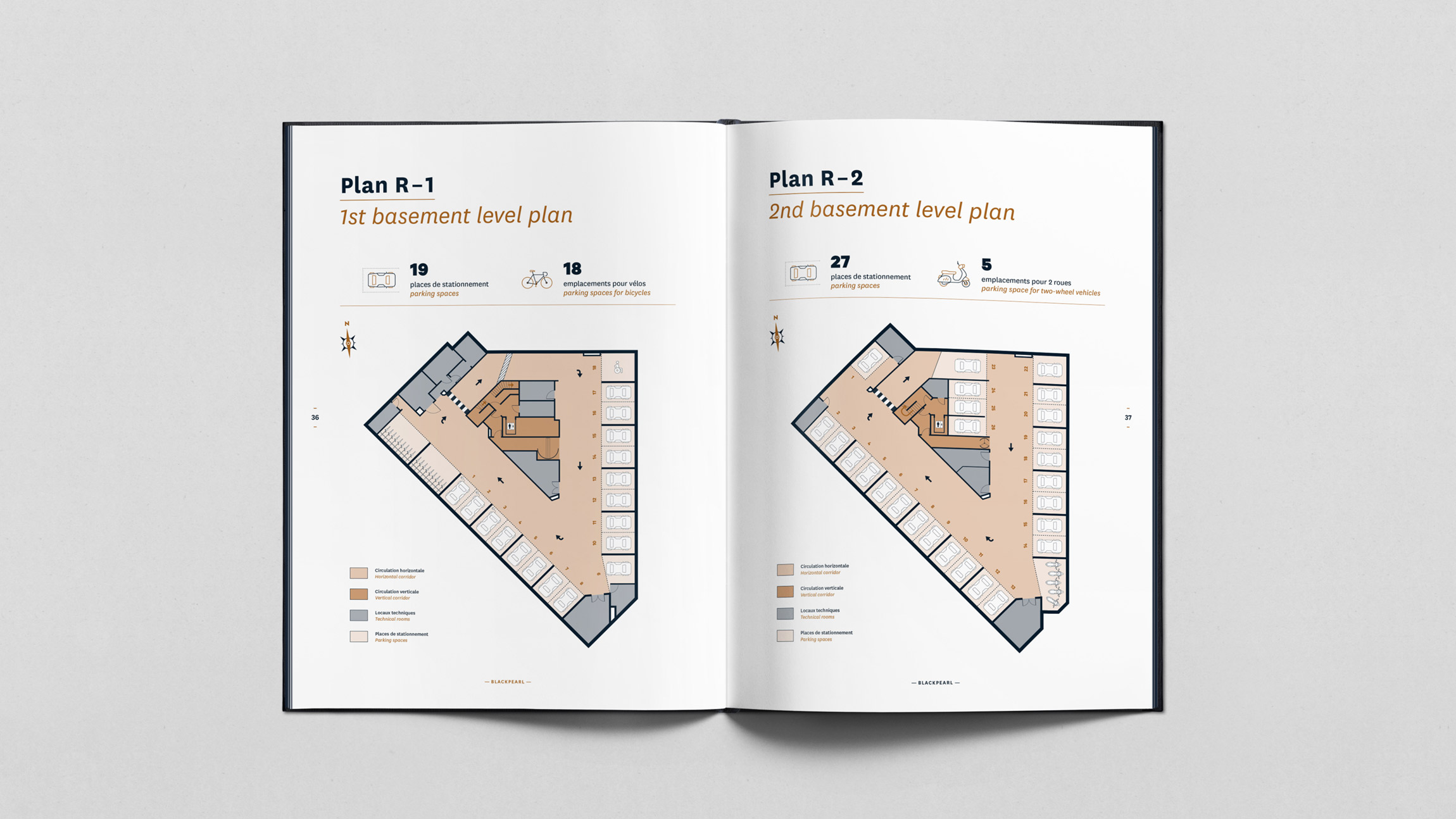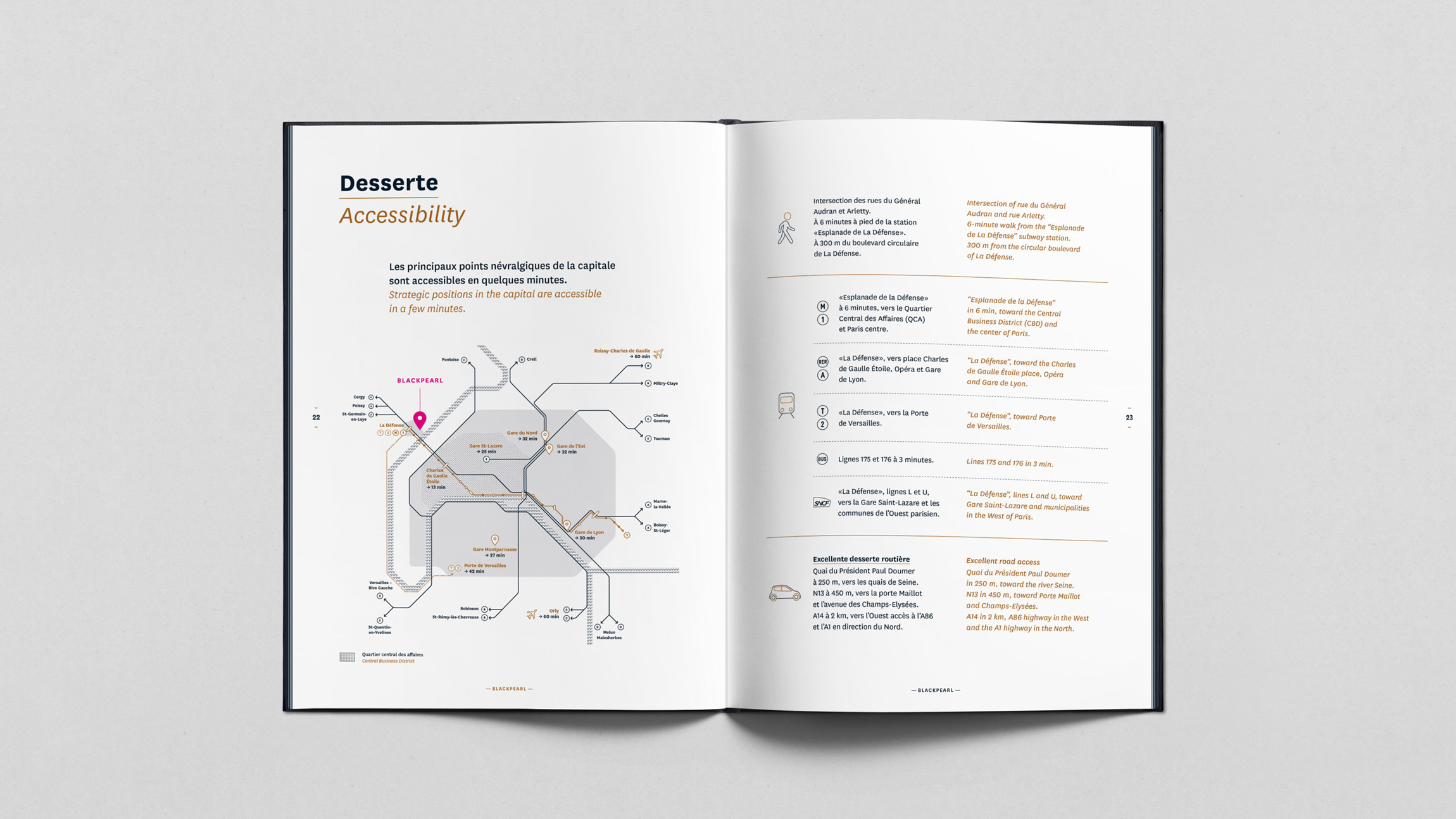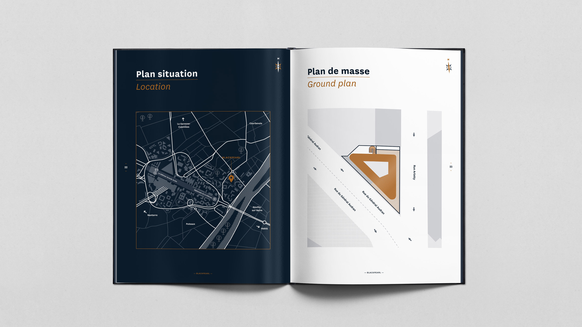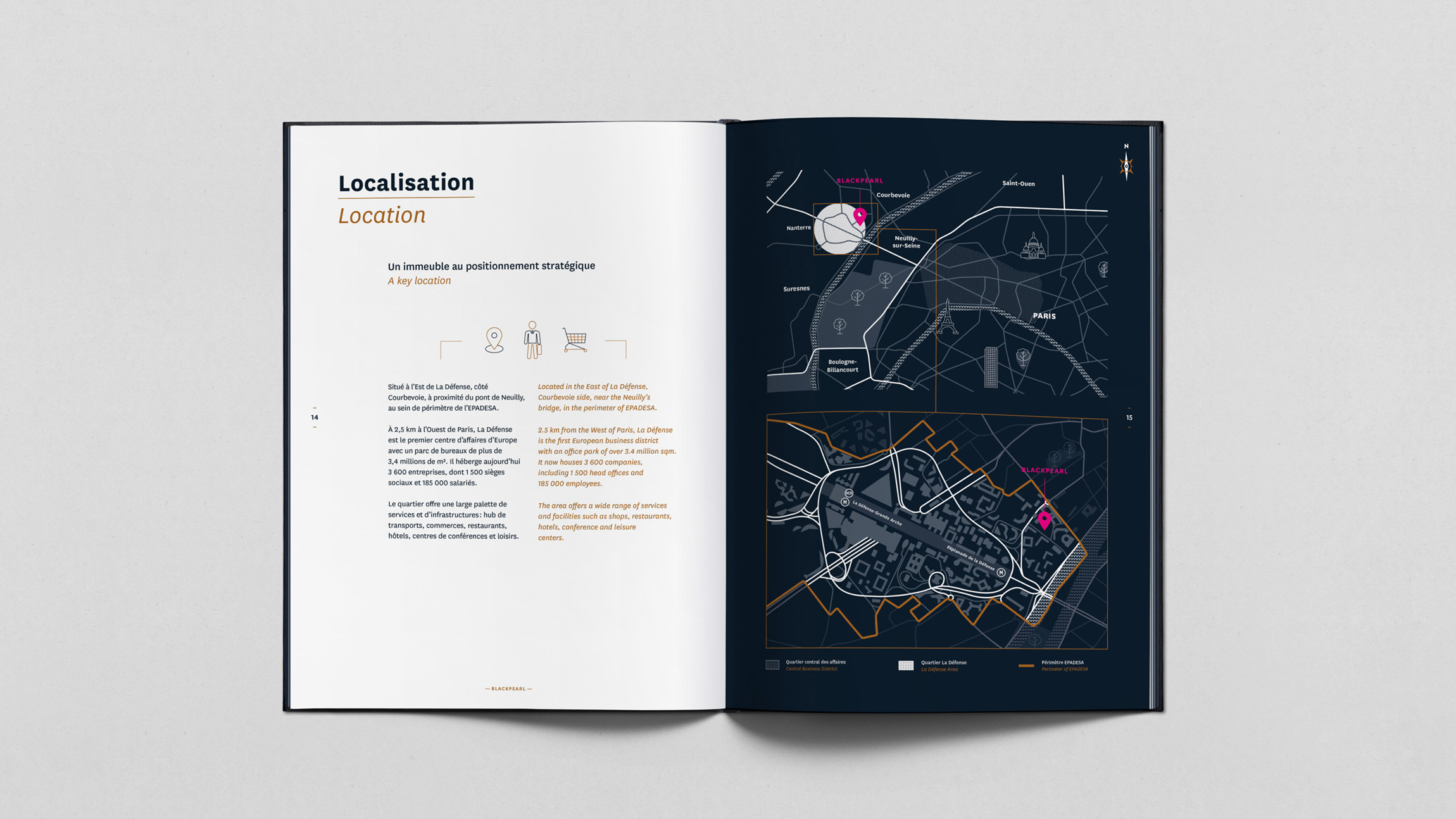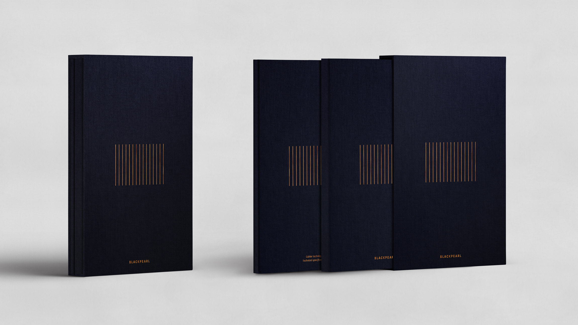 Conception graphique de deux ouvrages sur la nouvelle identité architecturale de l’immeuble Blackpearl situé à la Défense (Paris).