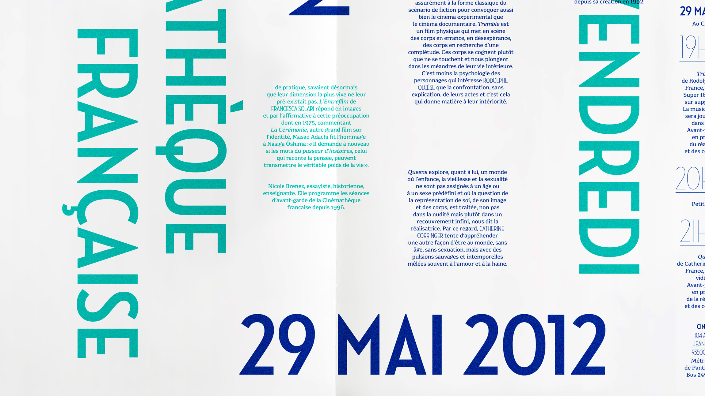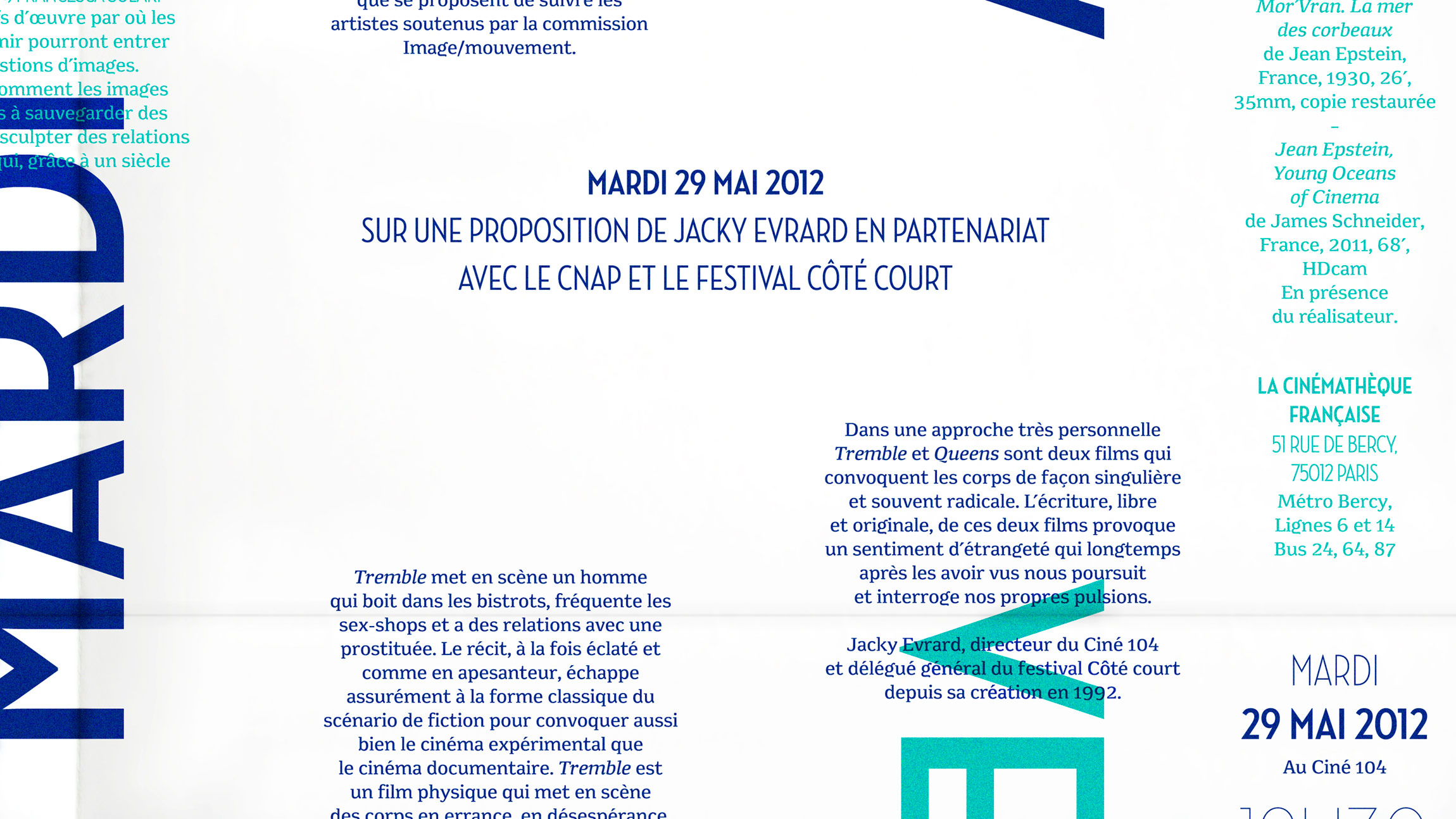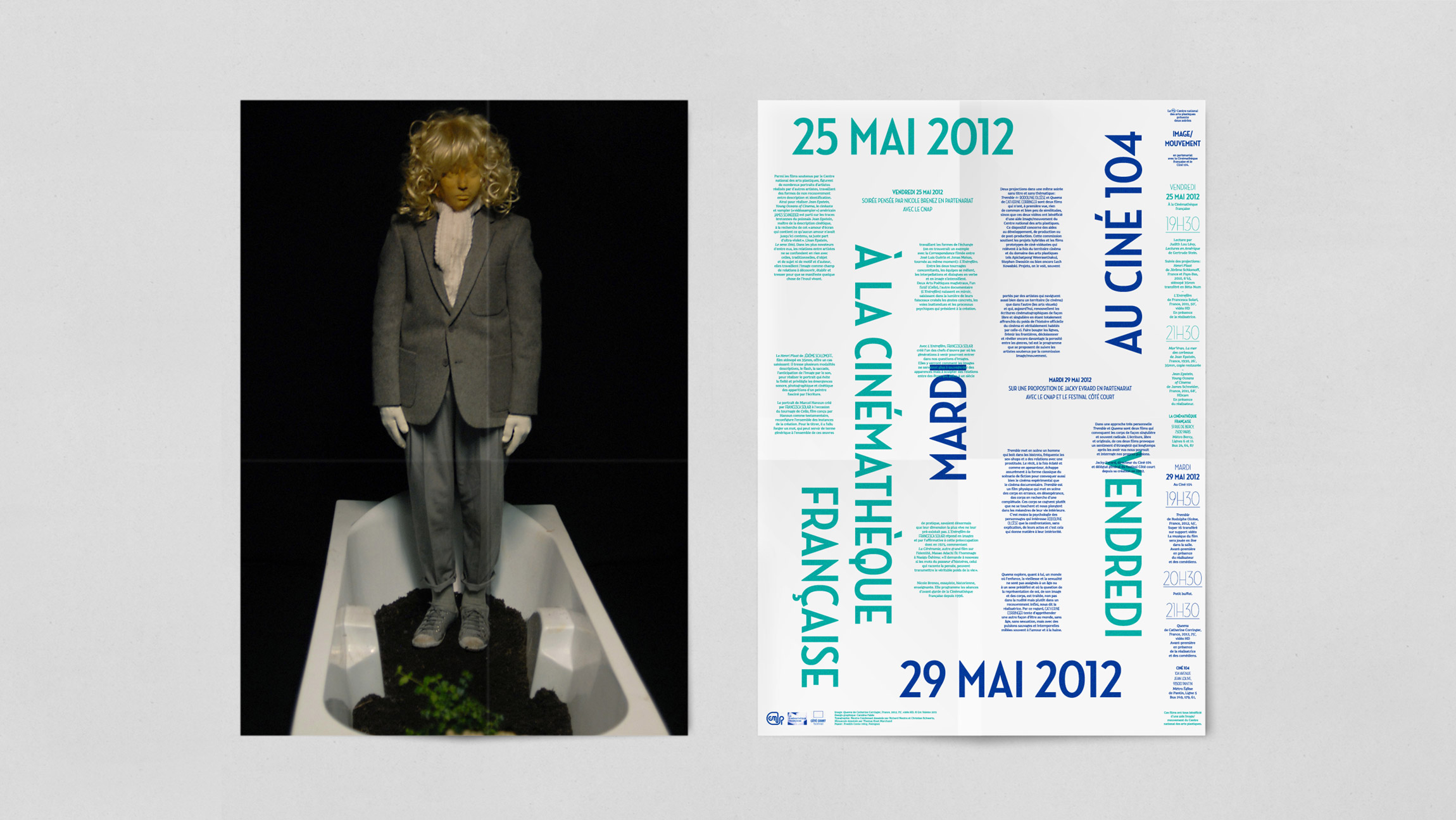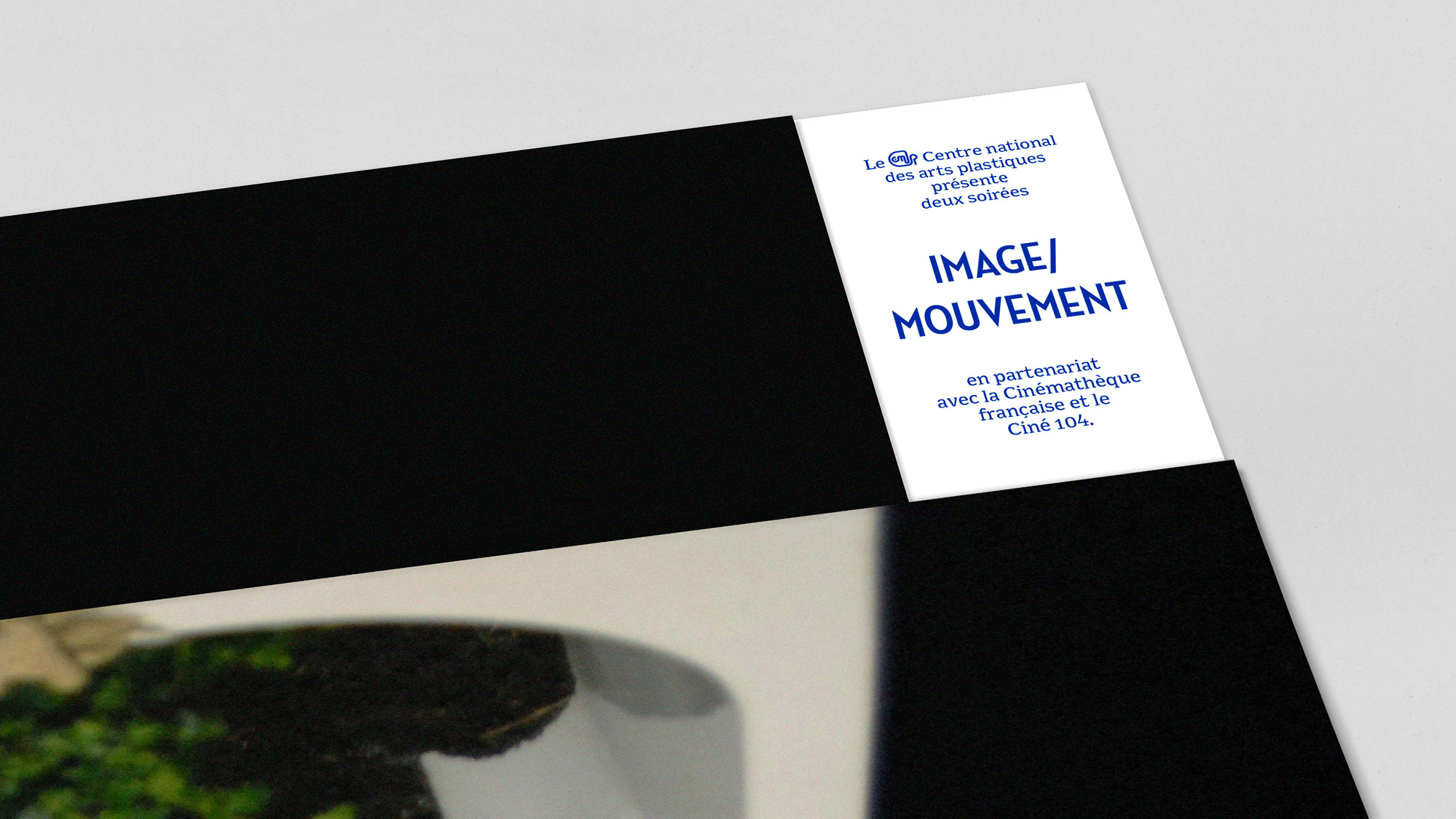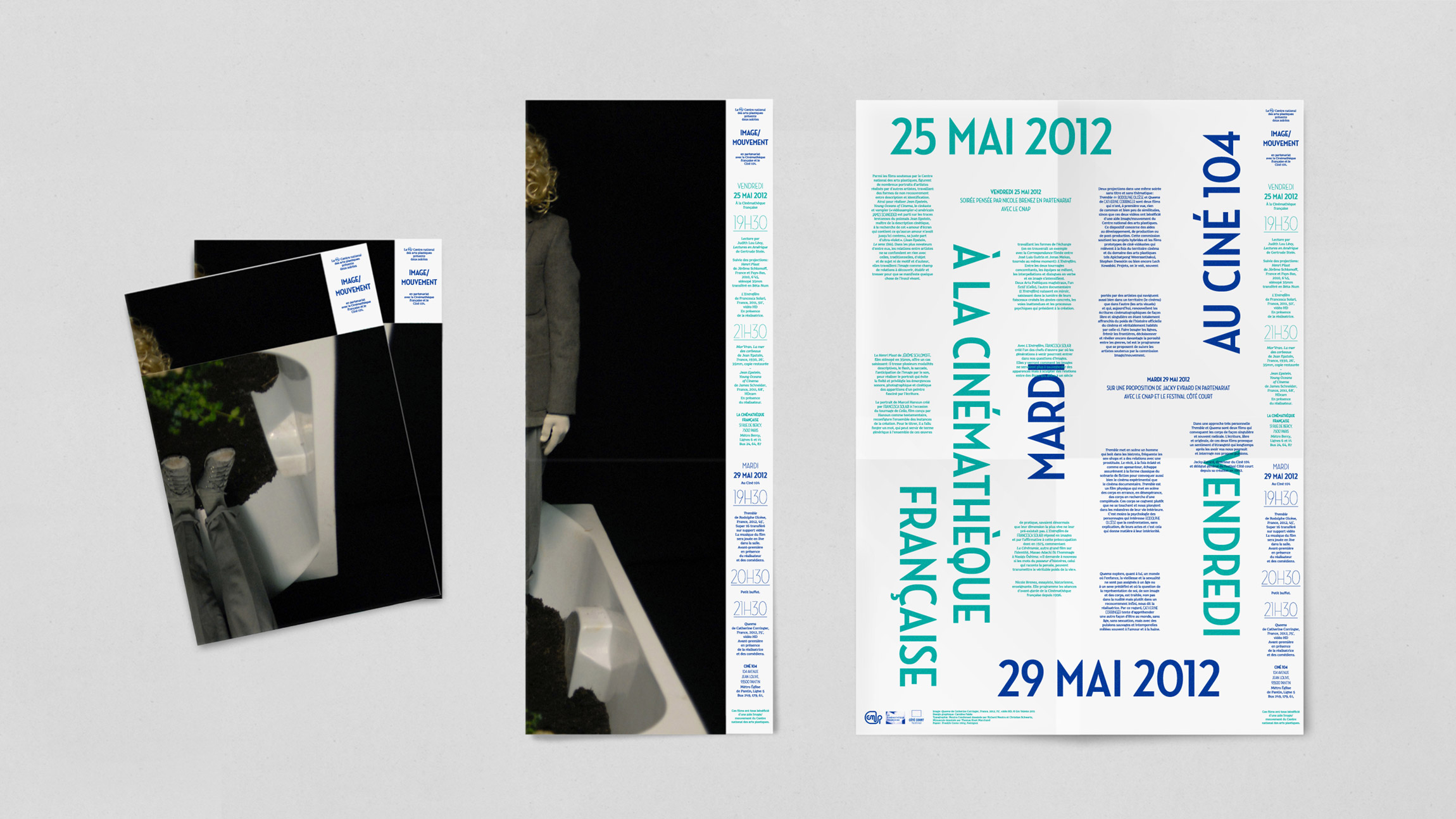 Image/mouvement – CNAP, poster/flyer, 2012, impression Indigo, 29,7 x 42 cm, 600 exemplaires Conception graphique d’un flyer/poster pour les soirées Image/mouvement organisées par le CNAP (Centre national des arts plastiques) en partenariat avec la Cinémathèque française et le Ciné 104.