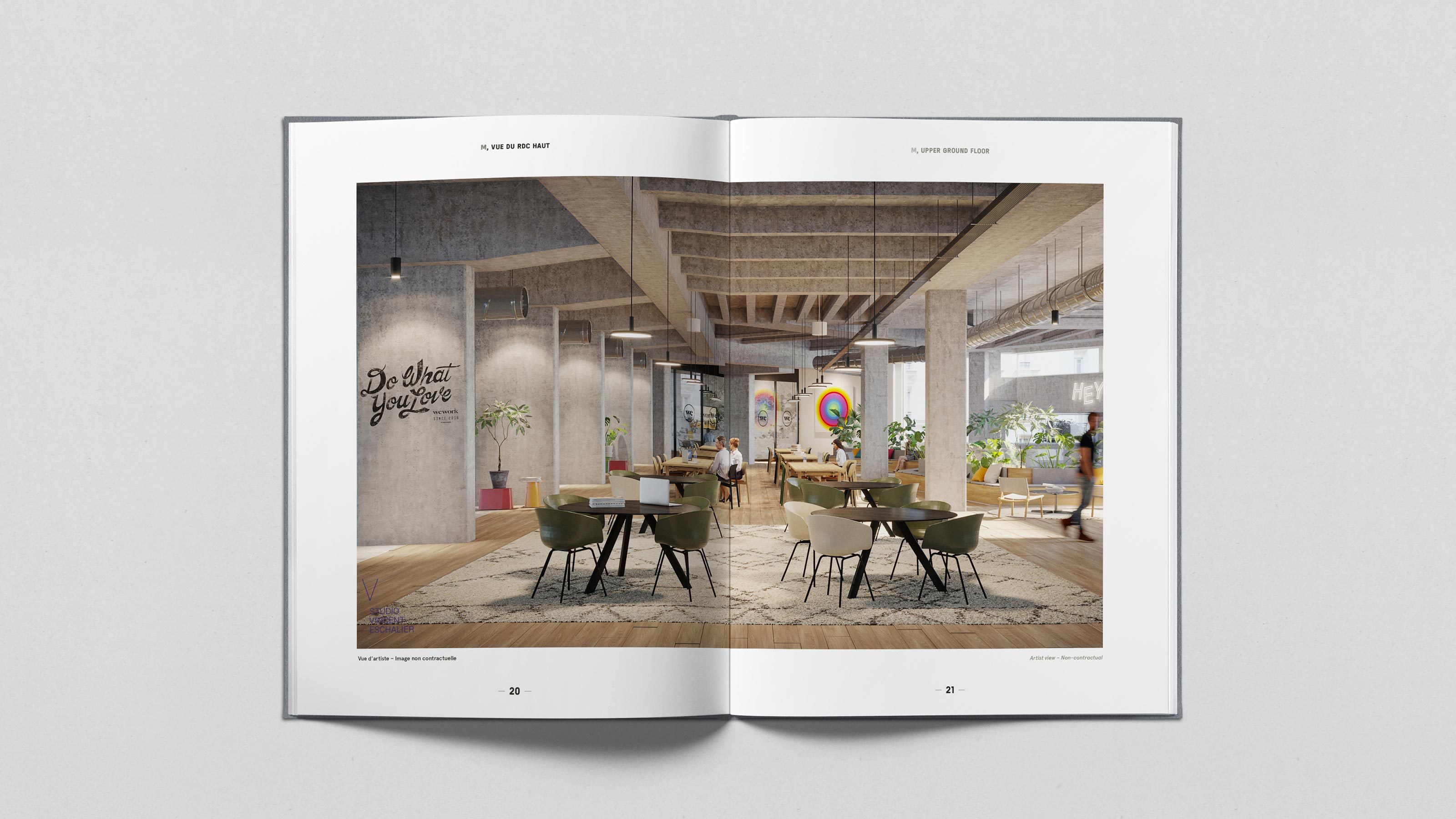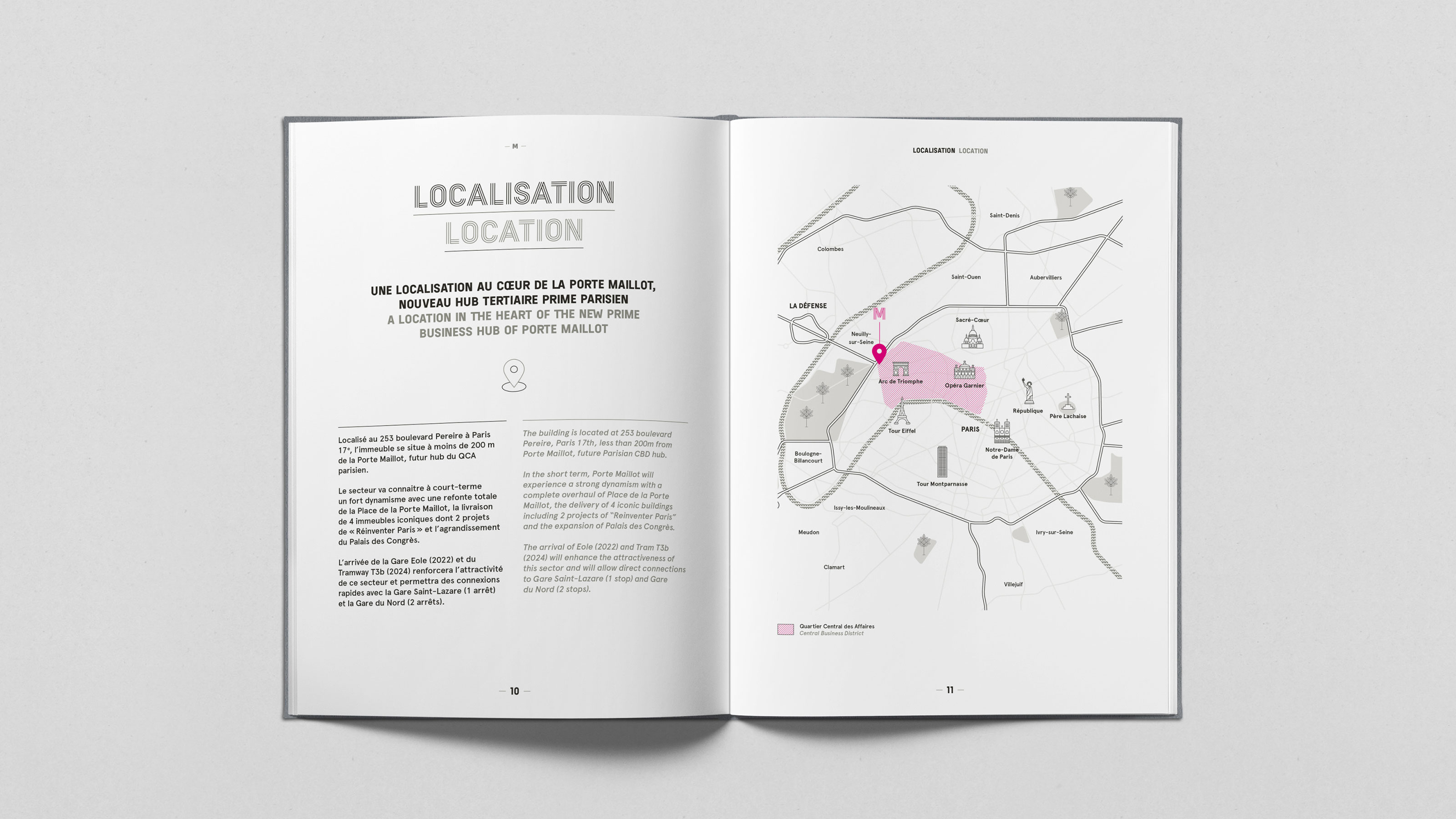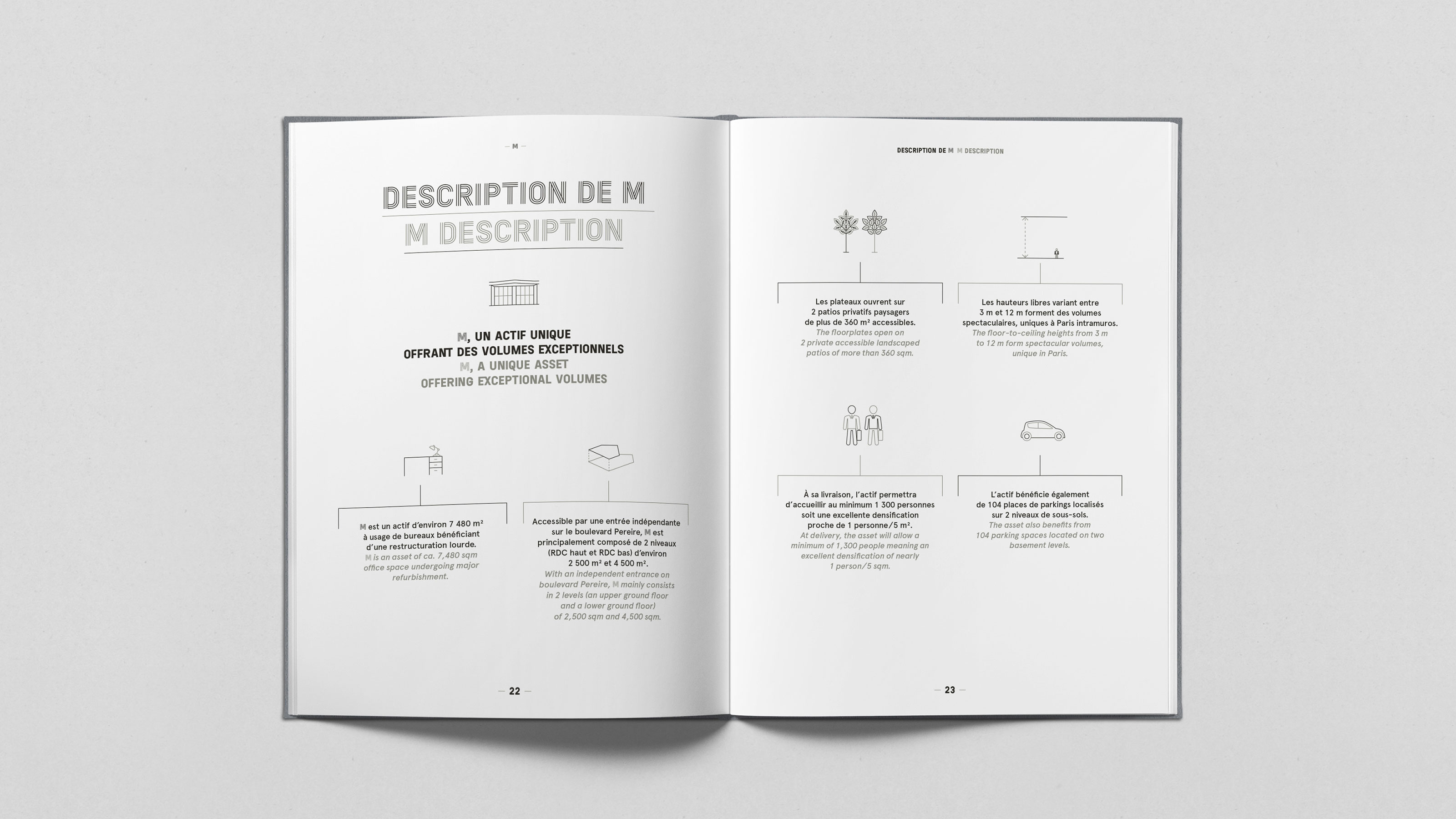Conception graphique de l’ouvrage de présentation du bâtiment M situé Porte Maillot (Paris).