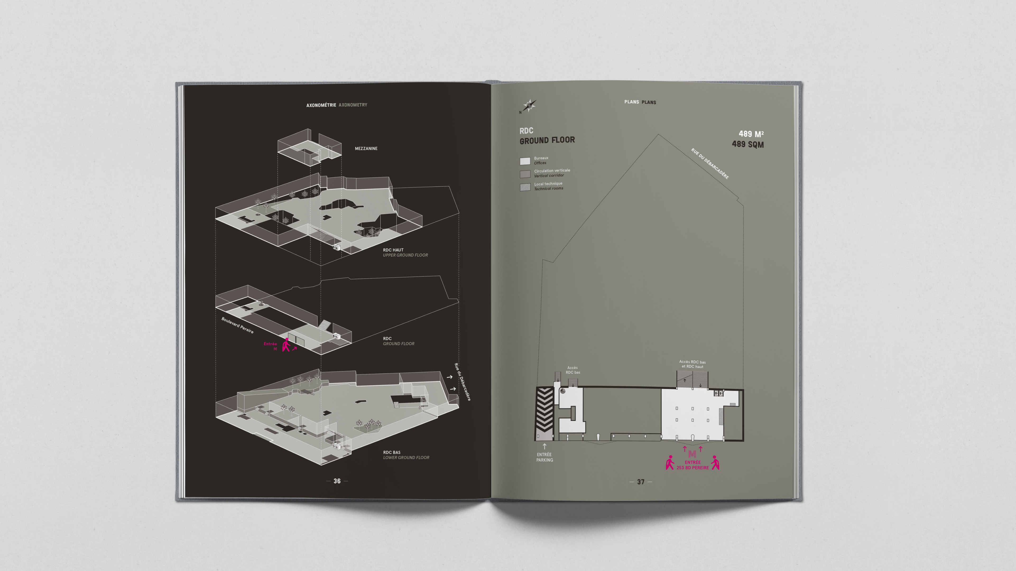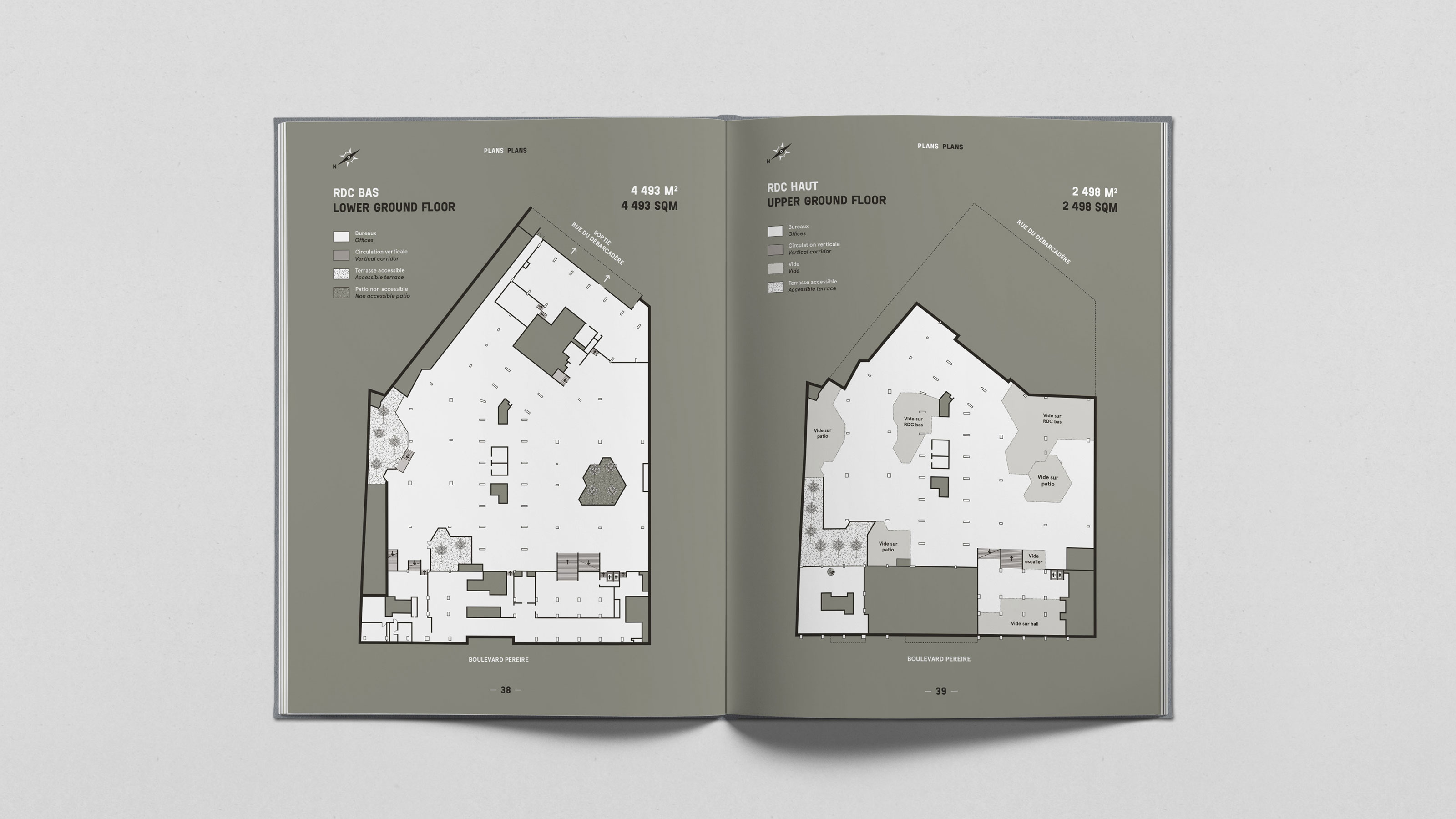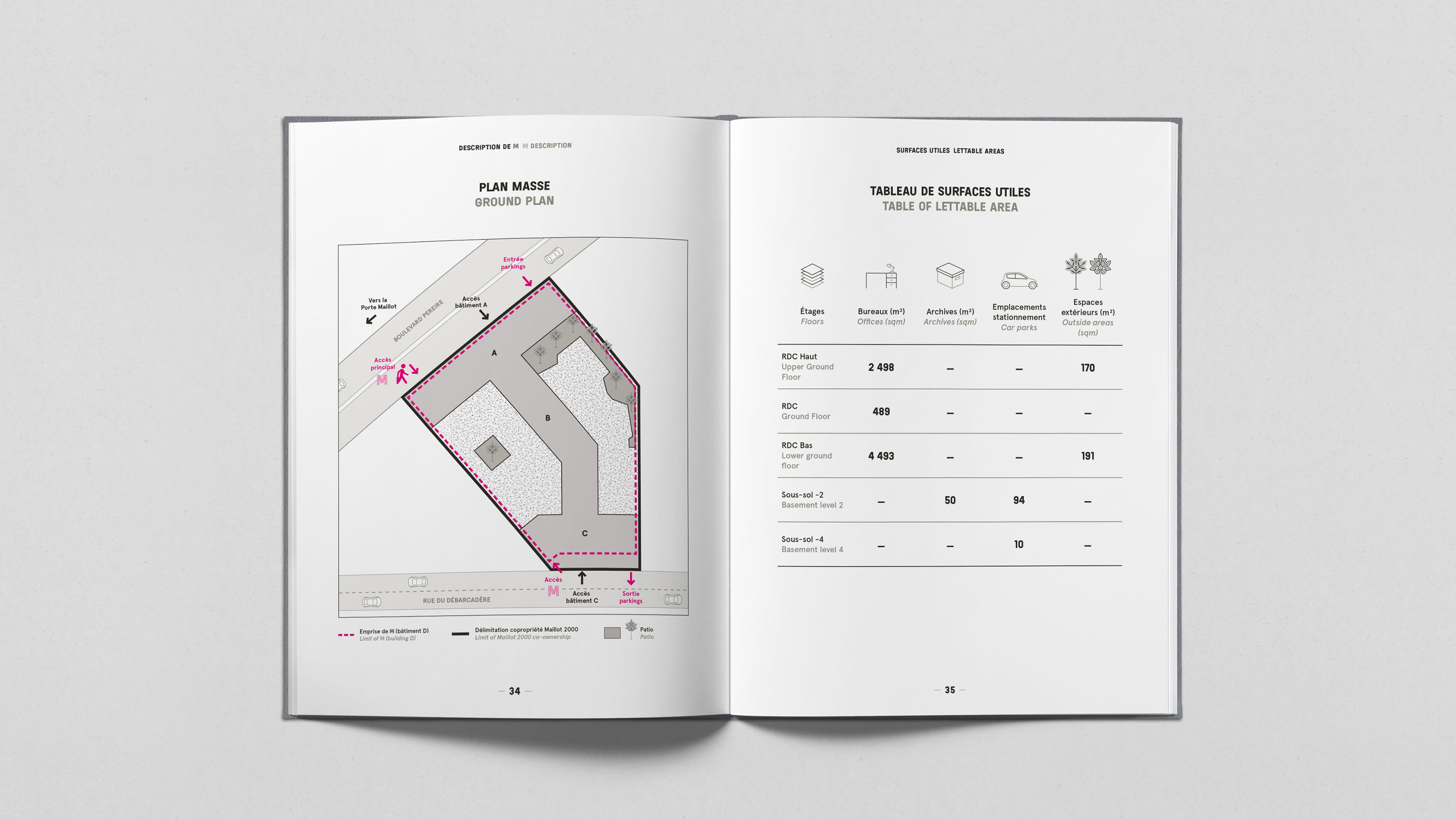 Conception graphique de l’ouvrage de présentation du bâtiment M situé Porte Maillot (Paris).