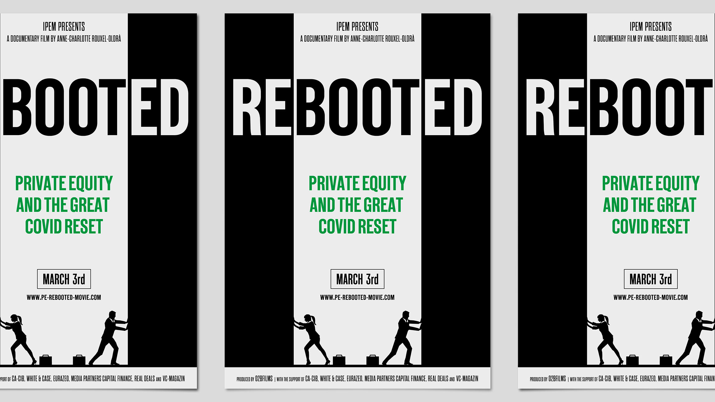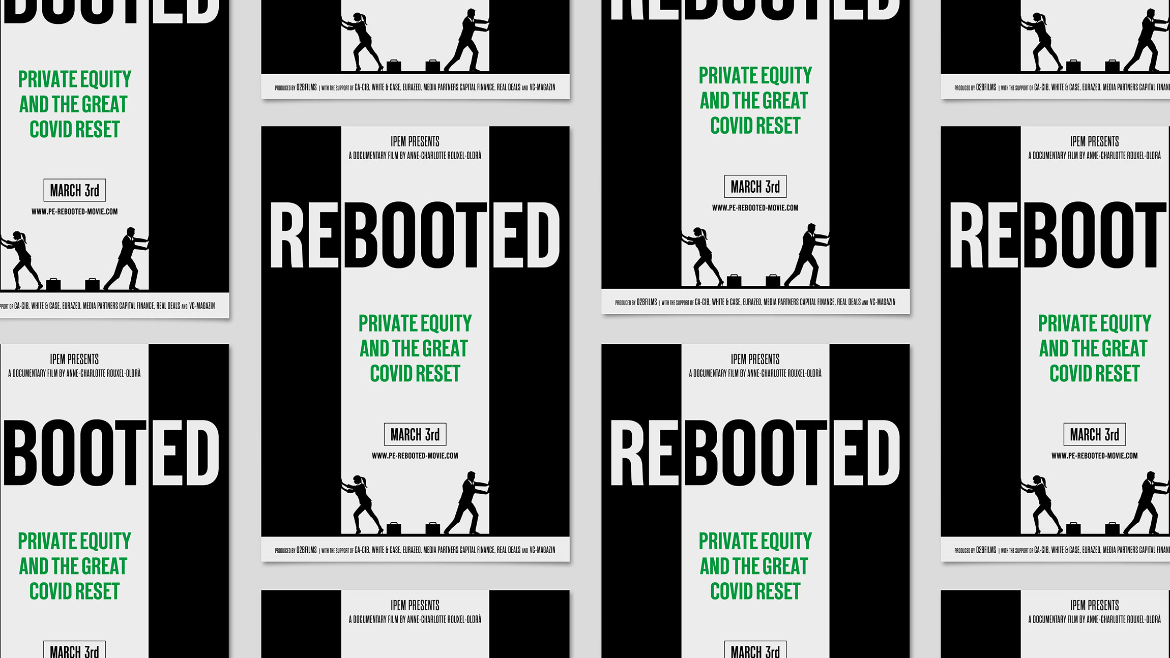 Conception graphique de l’affiche du film documentaire Rebooted Private Equity – The Great Covid Reset réalisé par Anne-Charlotte Rouxel-Oldrà et produit par l’IPEM.