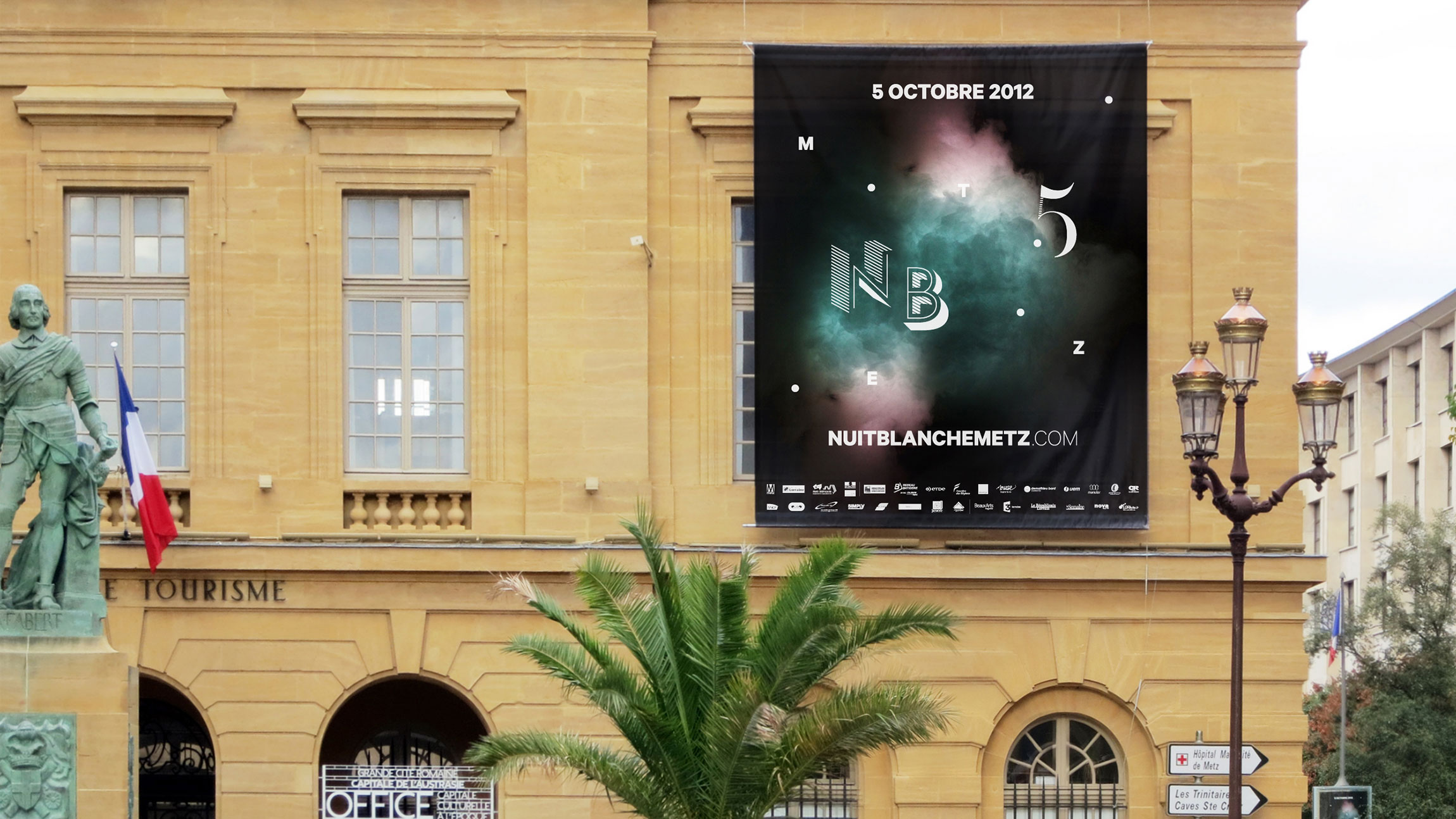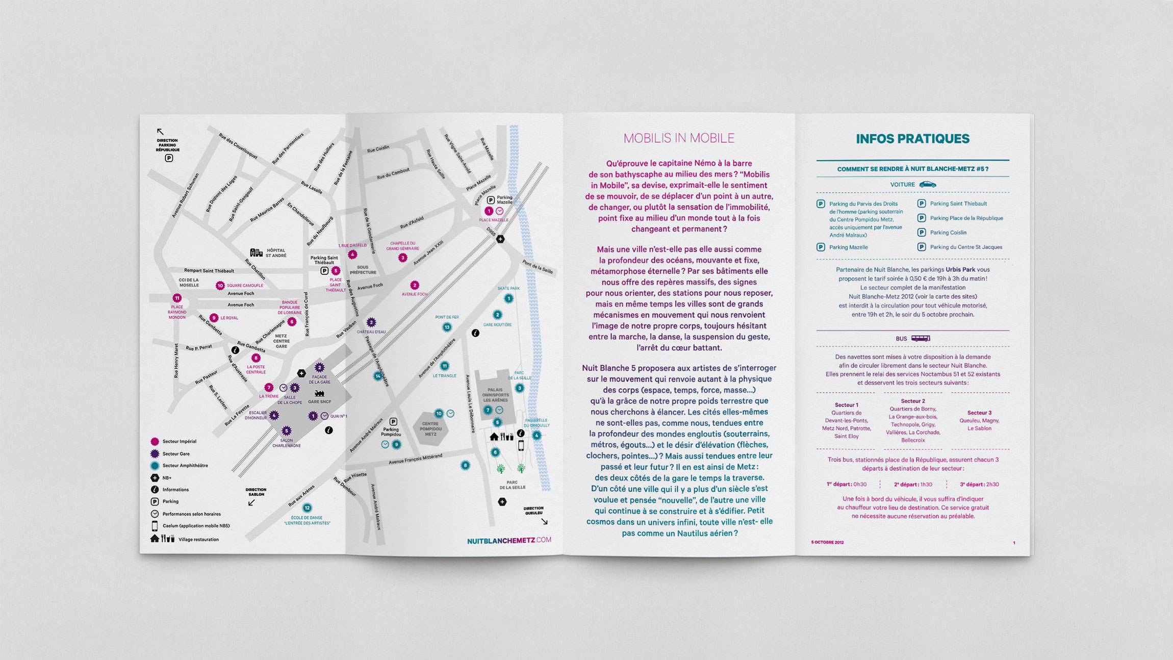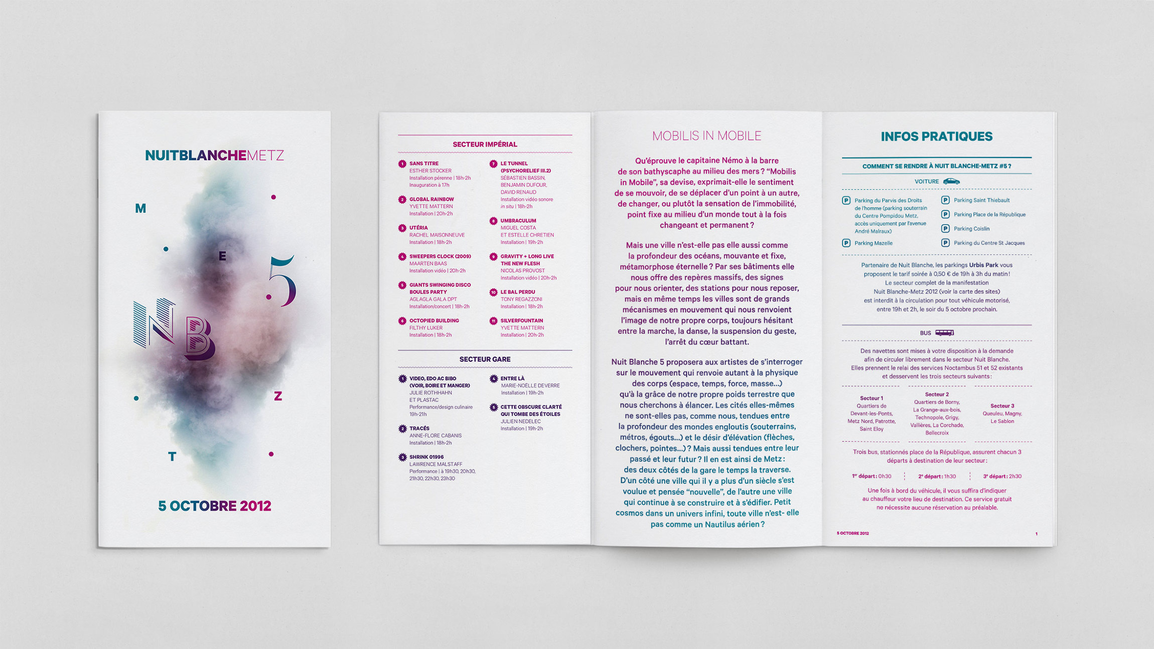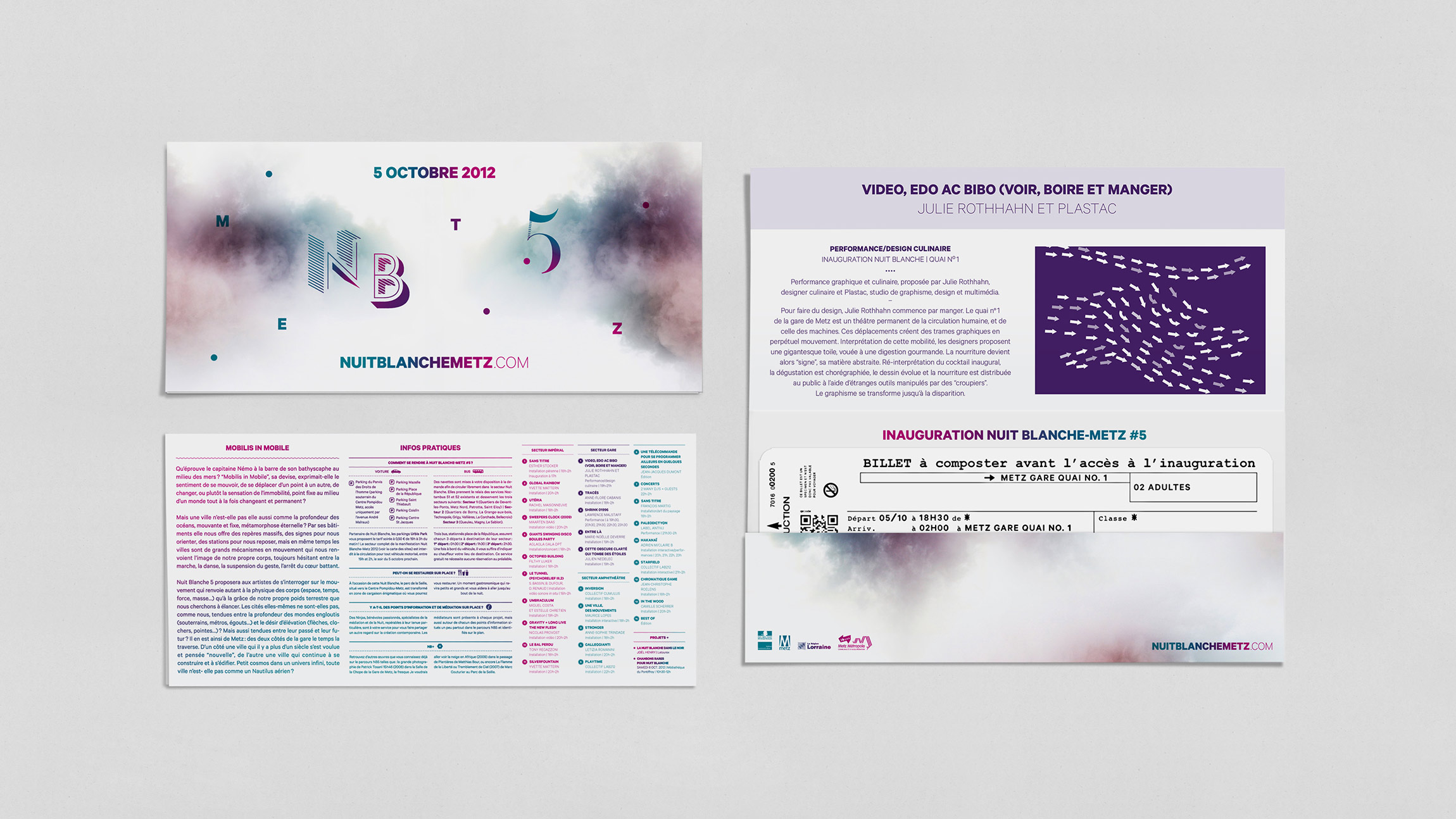 Création de la charte graphique de la 5e édition de Nuit Blanche Metz – NB5 (affichages, programmes, flyer, annonces presses, etc.).