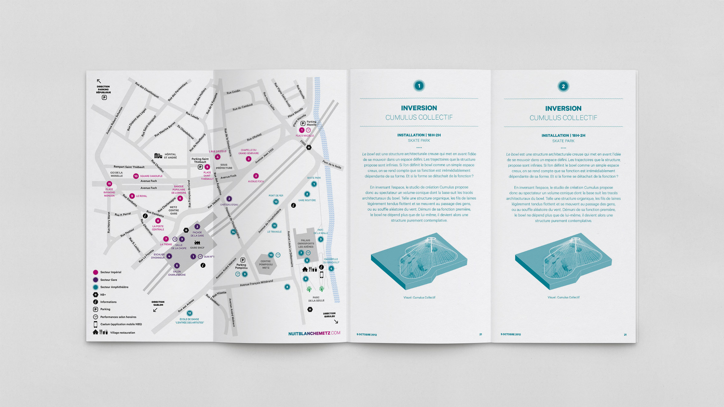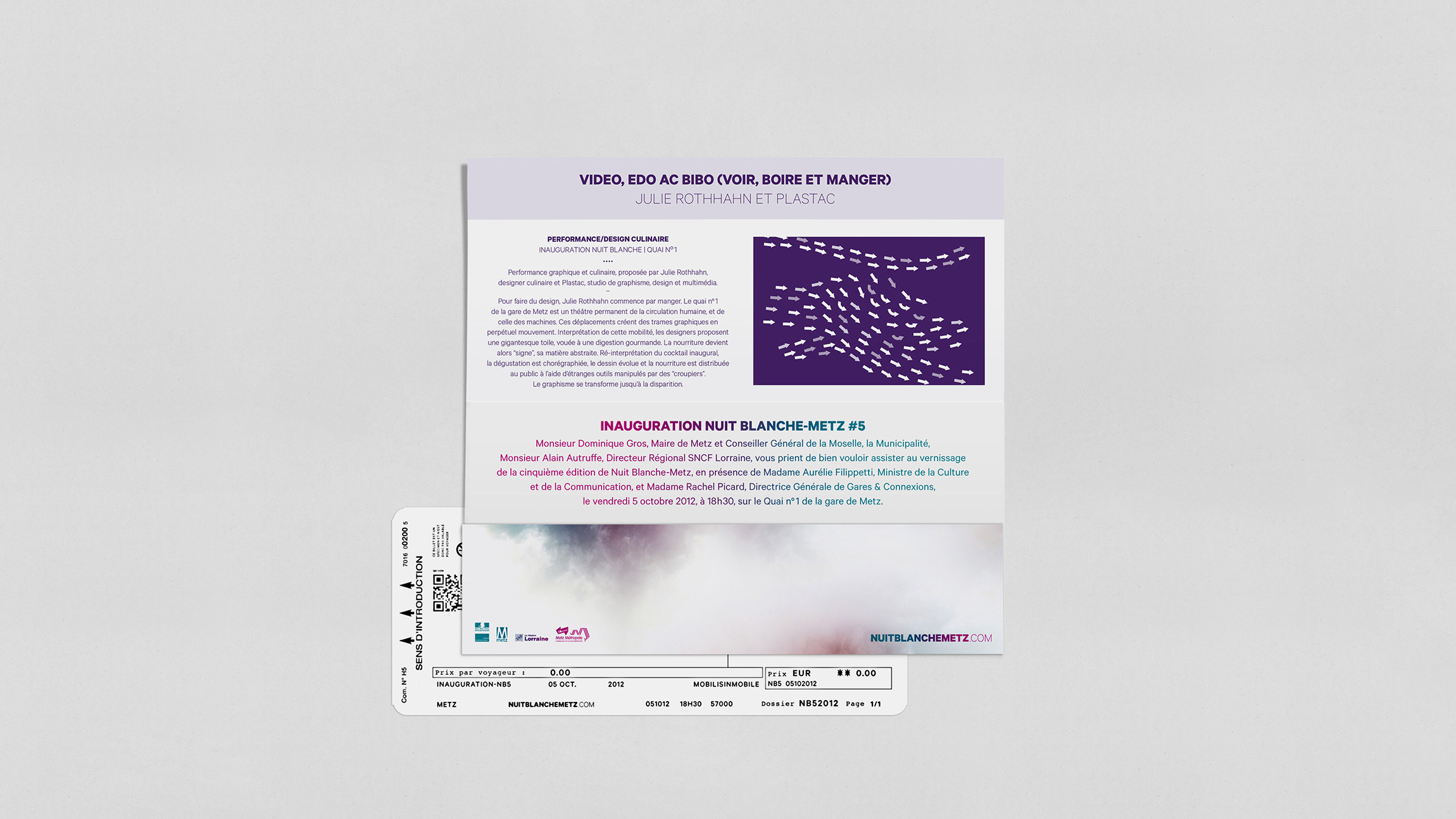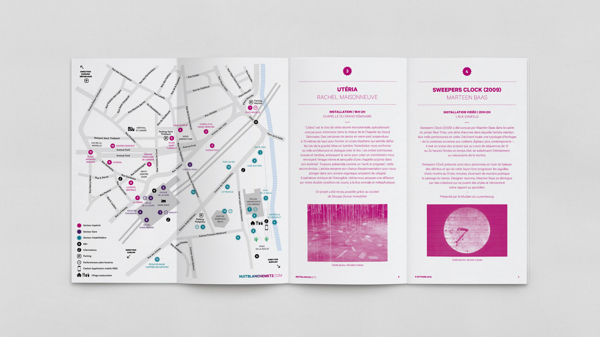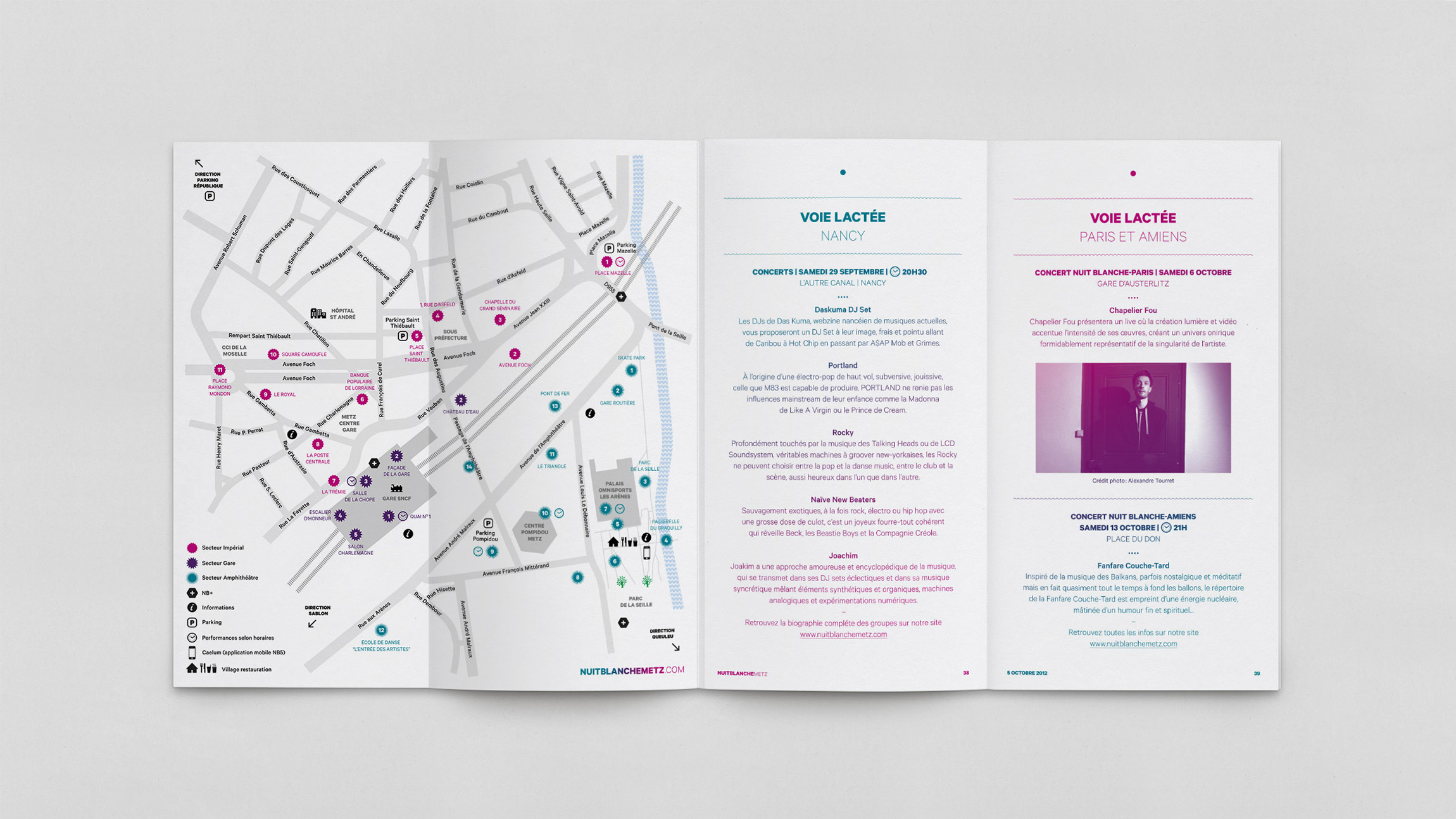 Création de la charte graphique de la 5e édition de Nuit Blanche Metz – NB5 (affichages, programmes, flyer, annonces presses, etc.).