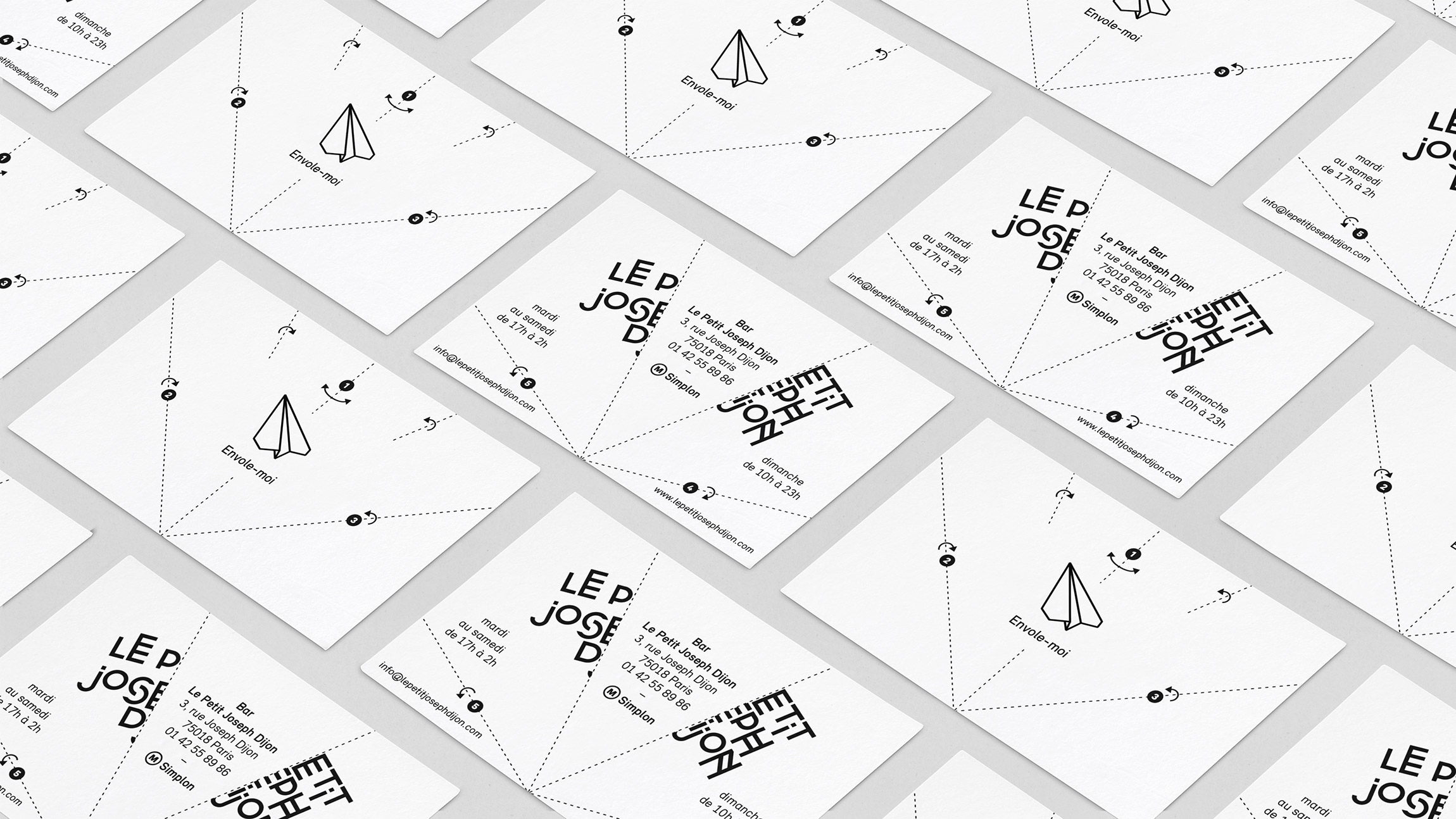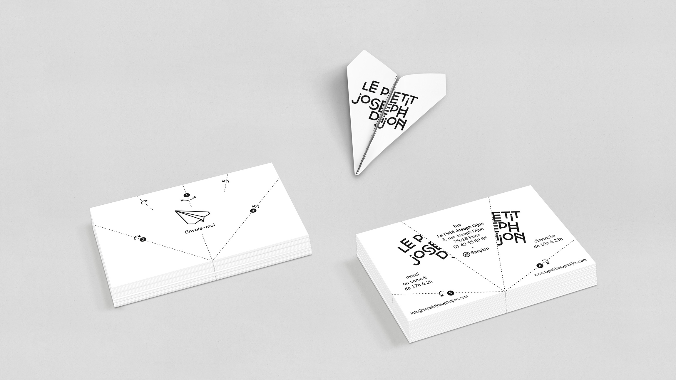 Conception graphique de cartes de visites à plier en avion pour le bar Petit Joseph Dijon situé à Paris 18.