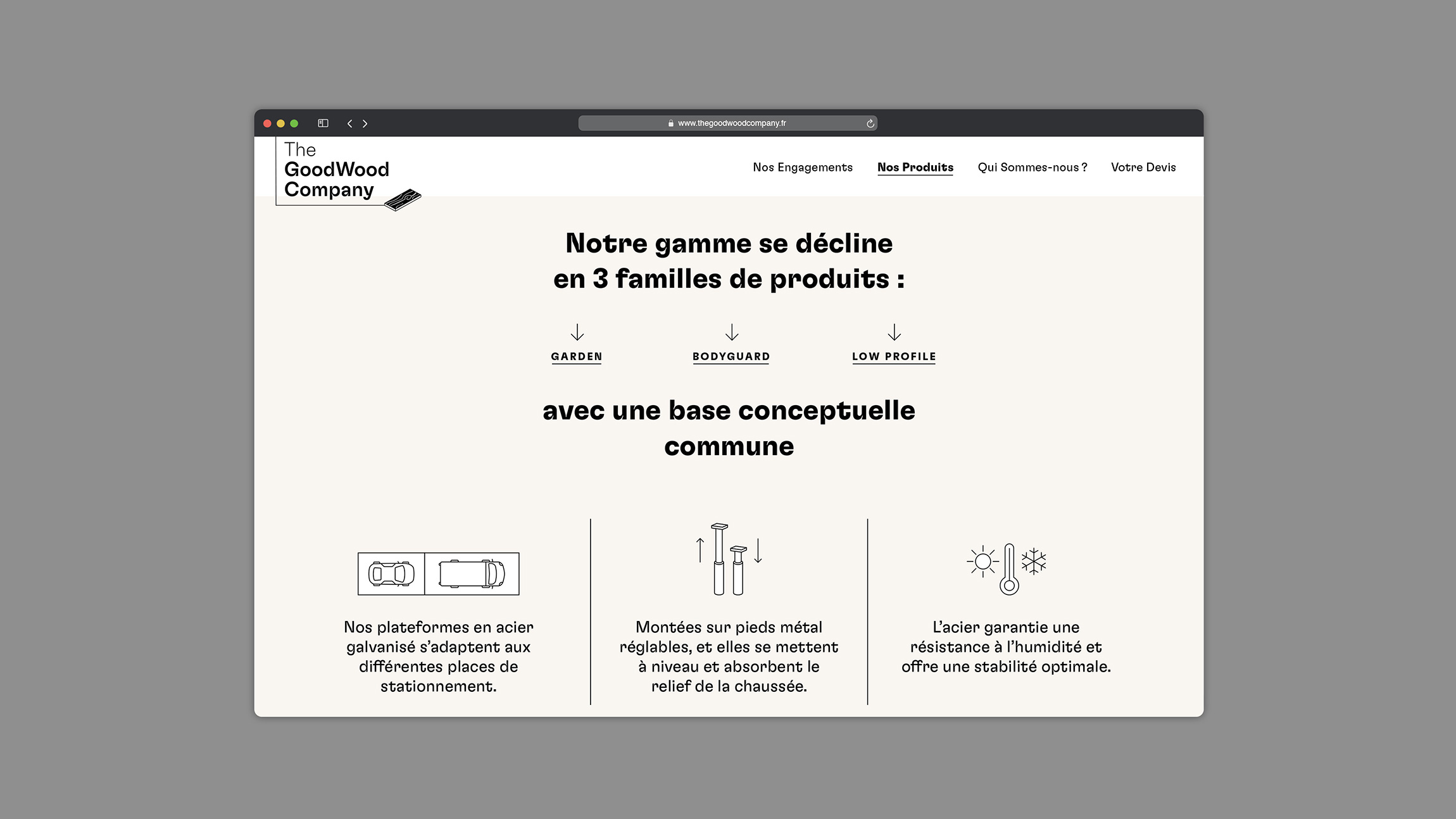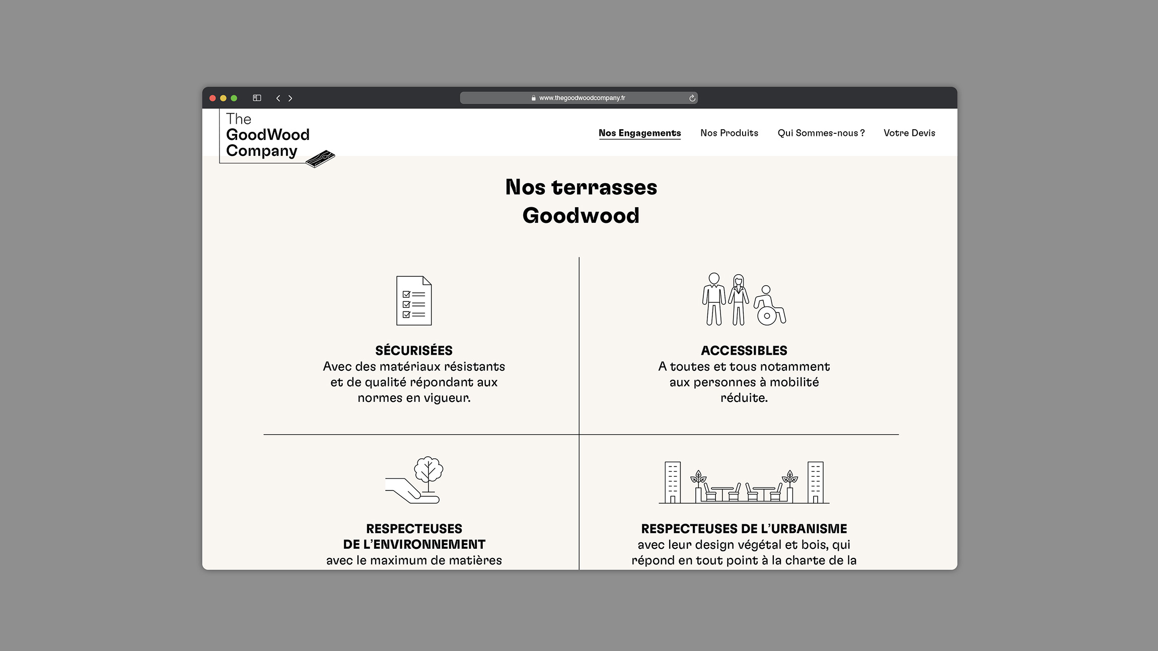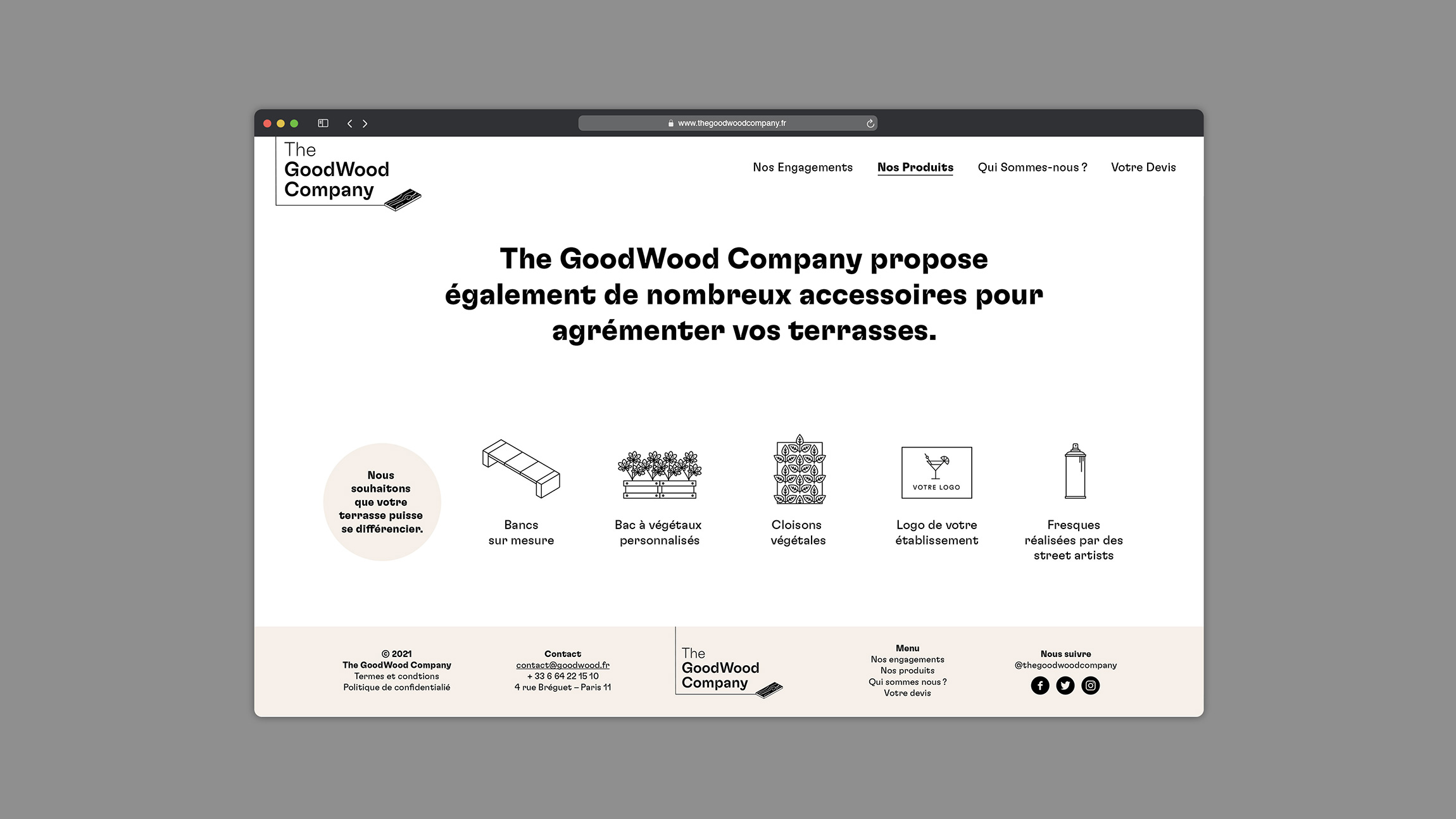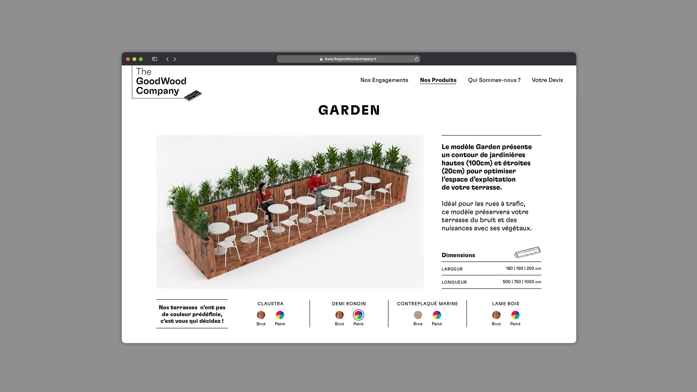 Conception graphique print et web de The GoodWood Company, concepteur et fabricants de terrasses éphémères pour les bars et restaurants.